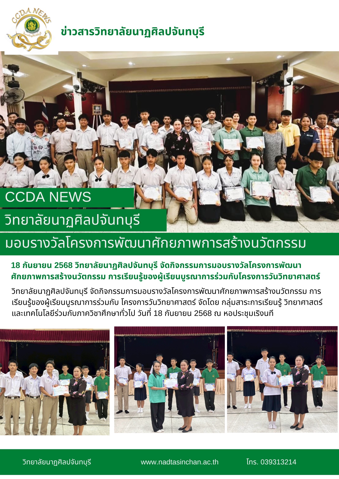 วิทยาลัยนาฏศิลปจันทบุรี จัดกิจกรรมการมอบรางวัลโครงการพัฒนาศักยภาพการสร้างนวัตกรรม การเรียนรู้ของผู้เรียนบูรณาการร่วมกับ โครงการวันวิทยาศาสตร์ จัดโดย กลุ่มสาระการเรียนรู้ วิทยาศาสตร์และเทคโนโลยีร่วมกับภาควิชาศึกษาทั่วไป วันที่ 18 กันยายน 2568 ณ หอประชุมเริงนที