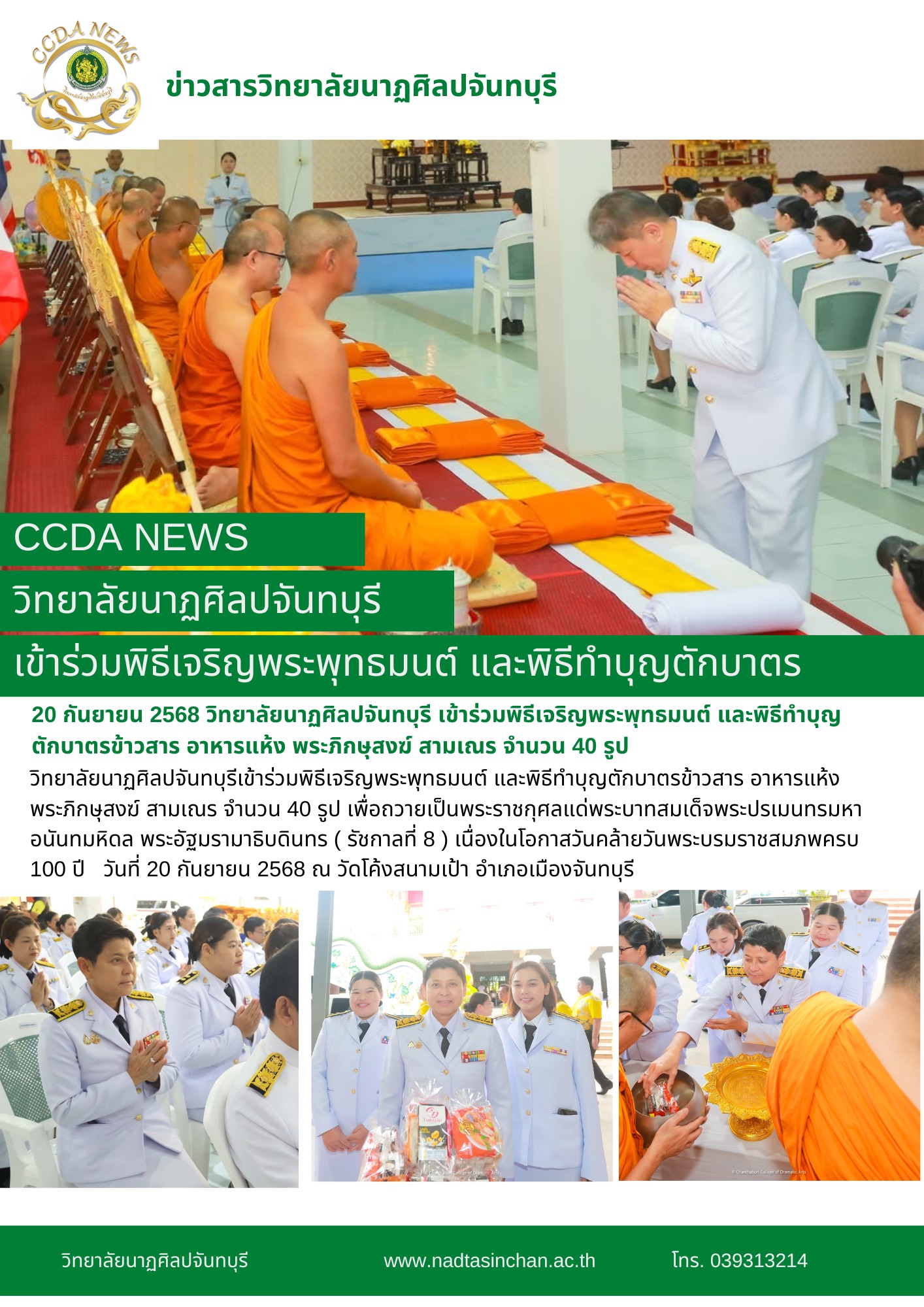 วิทยาลัยนาฏศิลปจันทบุรีเข้าร่วมพิธีเจริญพระพุทธมนต์ และพิธีทำบุญตักบาตรข้าวสาร อาหารแห้ง พระภิกษุสงฆ์ สามเณร จำนวน 40 รูป เพื่อถวายเป็นพระราชกุศลแด่พระบาทสมเด็จพระปรเมนทรมหาอนันทมหิดล พระอัฐมรามาธิบดินทร ( รัชกาลที่ 8 ) เนื่องในโอกาสวันคล้ายวันพระบรมราชสมภพครบ 100 ปี วันที่ 20 กันยายน 2568 ณ วัดโค้งสนามเป้า อำเภอเมืองจันทบุรี