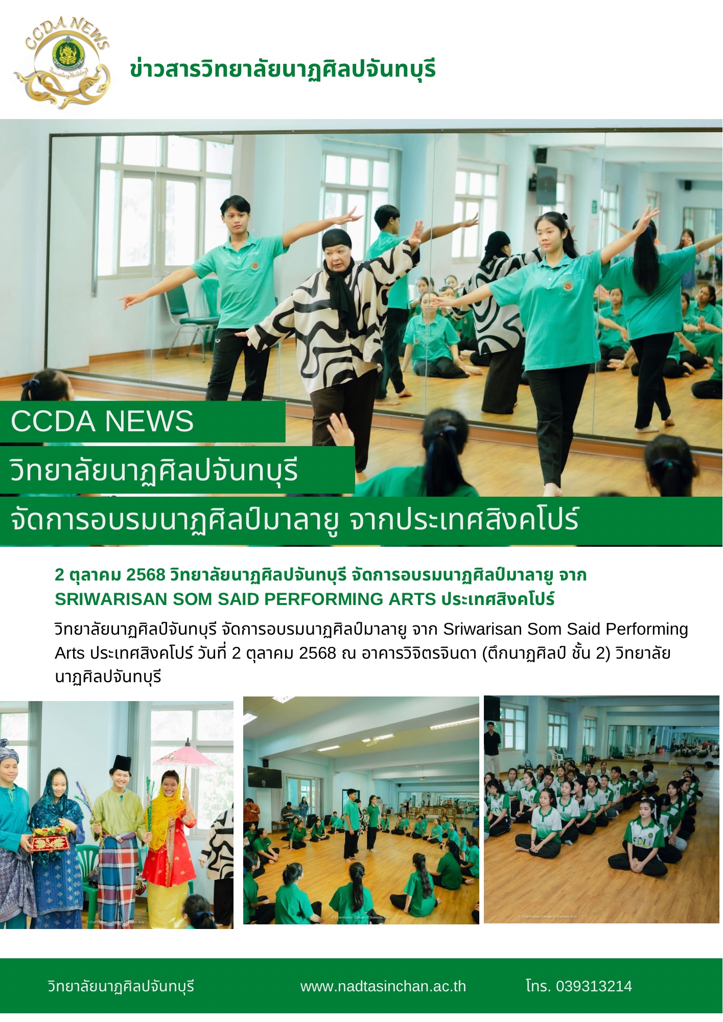 วิทยาลัยนาฏศิลป์จันทบุรี จัดการอบรมนาฏศิลป์มาลายู จาก Sriwarisan Som Said Performing Arts ประเทศสิงคโปร์ วันที่ 2 ตุลาคม 2568 ณ อาคารวิจิตรจินดา (ตึกนาฏศิลป์ ชั้น 2) วิทยาลัยนาฏศิลปจันทบุรี รับชมภาพเพิ่มเติม>>