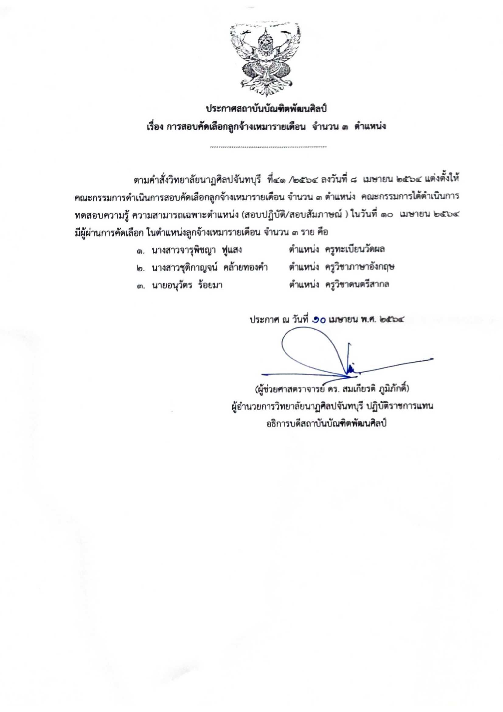 ตามคำสั่งวิทยาลัยนาฏศิลปจันทบุรี ที่ 41 / 2564 ลงวันที่ 8 เมษายน 2564 แต่งตั้งให้คณะกรรมการดำเนินการสอบคัดเลือกลูกจ้างเหมารายเดือน จำนวน 3 ตำแหน่ง คณะกรรมการได้ดำเนินการทดสอบความรู้ ความสามารถเฉพาะตำแหน่ง (สอบปฏิบัติ/สอบสัมภาษณ์) ในวันที่ 10 เมษายน 2564 มีผู้ผ่านการคัดเลือก ในตำแหน่งลูกจ้างเหมารายเดือน จำนวน 3 ราย คือ