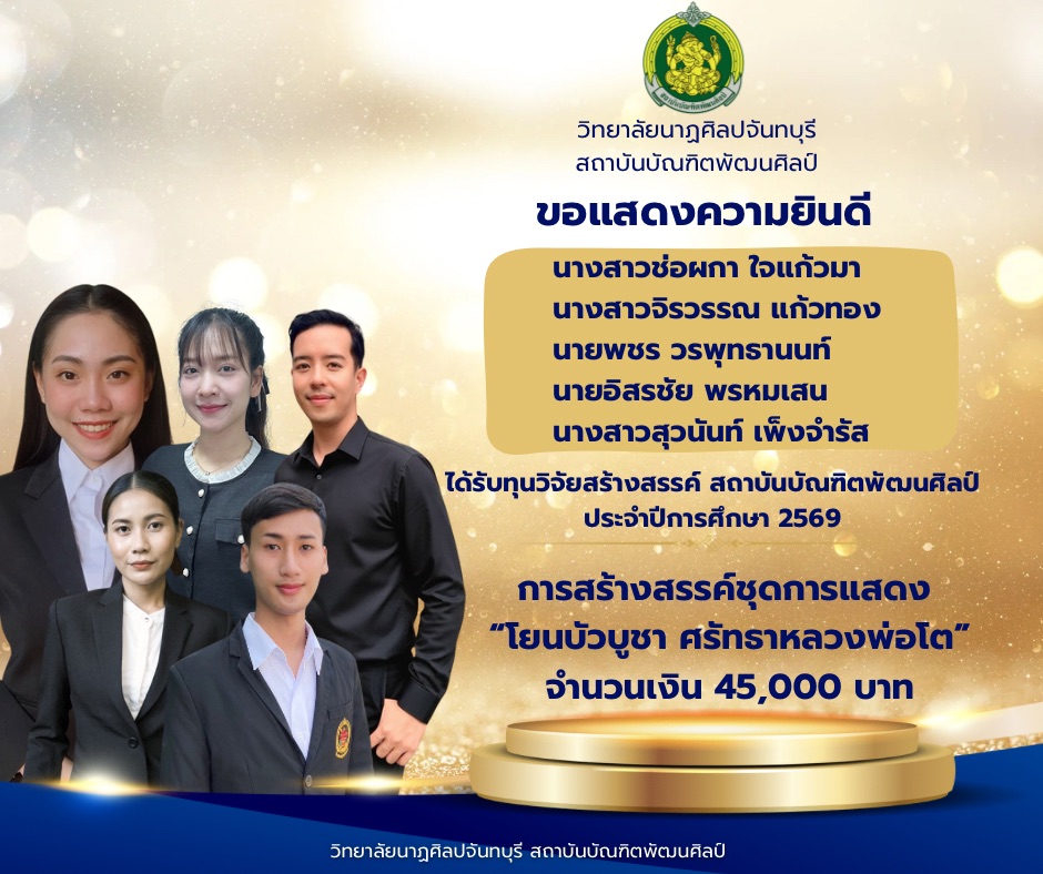 ?วิทยาลัยนาฏศิลปจันทบุรี สถาบันบัณฑิตพัฒนศิลป์ ขอแสดงความยินดี นางสาวช่อผกา ใจแก้วมา นางสาวจิรวรรณ แก้วทอง นายพชร วรพุทธานนท์ นายอิสรชัย พรหมเสน นางสาวสุวนันท์ เพ็งจำรัส ได้รับทุนวิจัยสร้างสรรค์ สถา