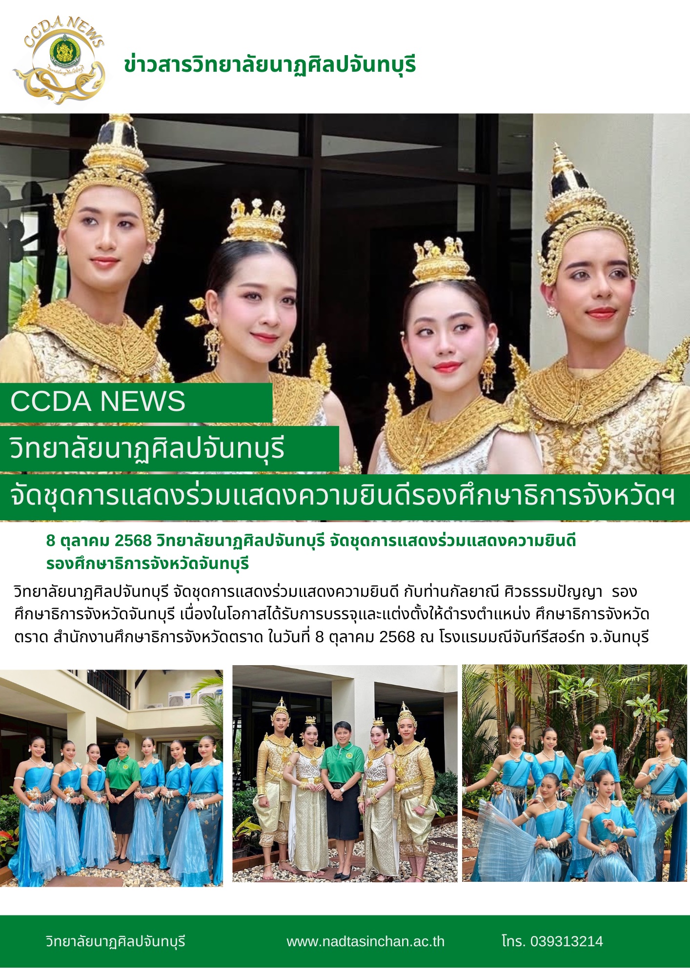วิทยาลัยนาฏศิลปจันทบุรี จัดชุดการแสดงร่วมแสดงความยินดี กับท่านกัลยาณี ศิวธรรมปัญญา รองศึกษาธิการจังหวัดจันทบุรี เนื่องในโอกาสได้รับการบรรจุและแต่งตั้งให้ดำรงตำแหน่ง ศึกษาธิการจังหวัดตราด สำนักงานศึกษาธิการจังหวัดตราด ในวันที่ 8 ตุลาคม 2568 ณ โรงแรมมณีจันท์รีสอร์ท อ.เมือง จ.จันทบุรี