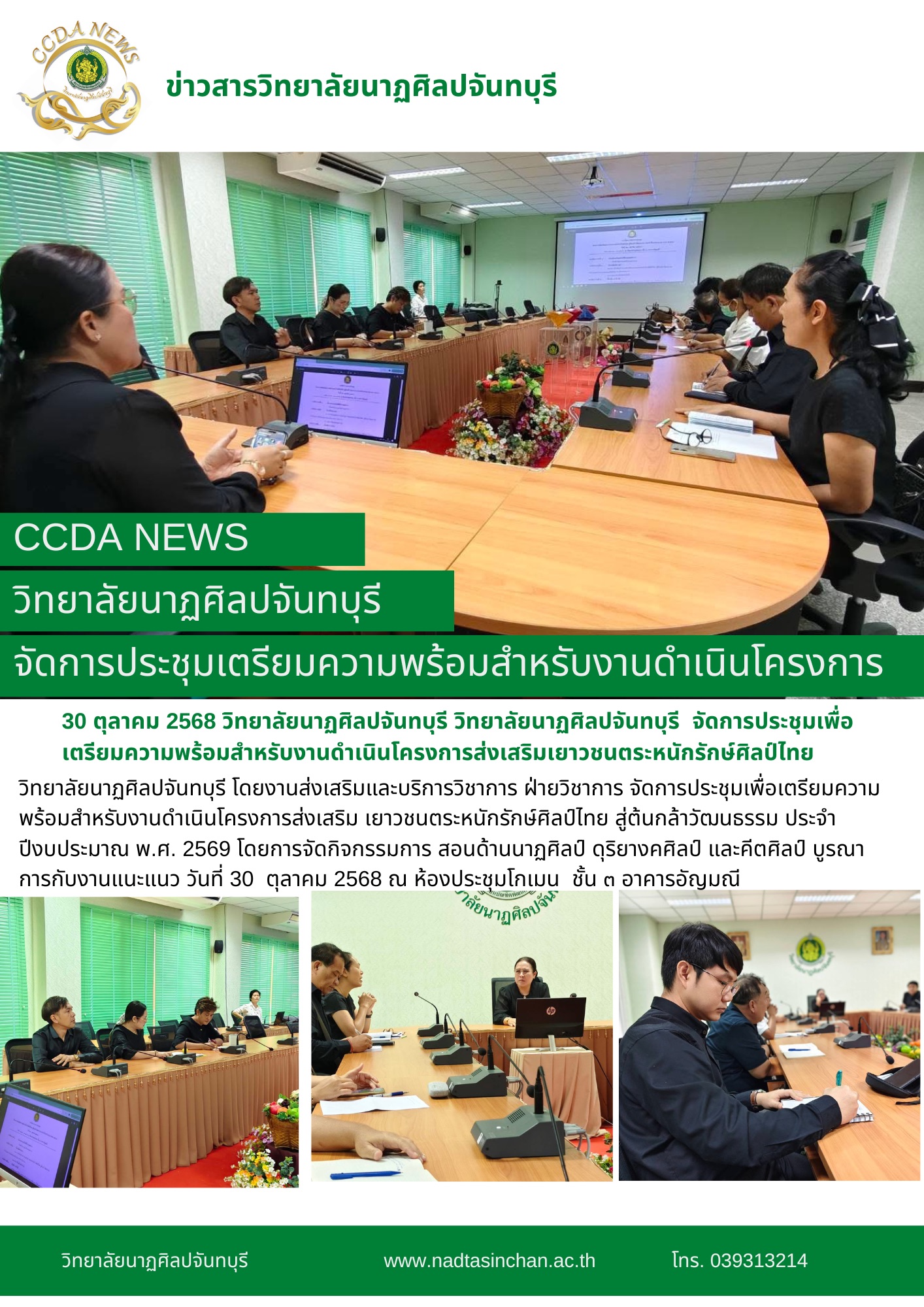 วิทยาลัยนาฏศิลปจันทบุรี โดยงานส่งเสริมและบริการวิชาการ ฝ่ายวิชาการ จัดการประชุมเพื่อเตรียมความพร้อมสำหรับงานดำเนินโครงการส่งเสริม เยาวชนตระหนักรักษ์ศิลป์ไทย สู่ต้นกล้าวัฒนธรรม ประจำปีงบประมาณ พ.ศ. 2569 โดยการจัดกิจกรรมการ สอนด้านนาฏศิลป์ ดุริยางคศิลป์ และคีตศิลป์ บูรณาการกับงานแนะแนว วันที่ 30 ตุลาคม 2568 ณ ห้องประชุมโกเมน ชั้น ๓ อาคารอัญมณี