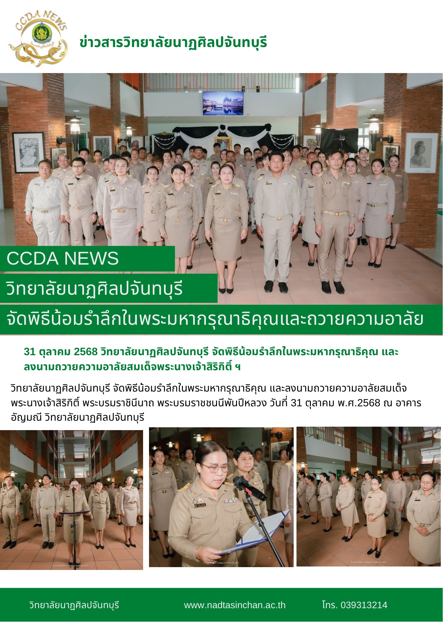 วิทยาลัยนาฏศิลปจันทบุรี จัดพิธีน้อมรำลึกในพระมหากรุณาธิคุณ และลงนามถวายความอาลัยสมเด็จพระนางเจ้าสิริกิติ์ พระบรมราชินีนาถ พระบรมราชชนนีพันปีหลวง วันที่ 31 ตุลาคม พ.ศ.2568 ณ อาคารอัญมณี วิทยาลัยนาฏศิลปจันทบุรี