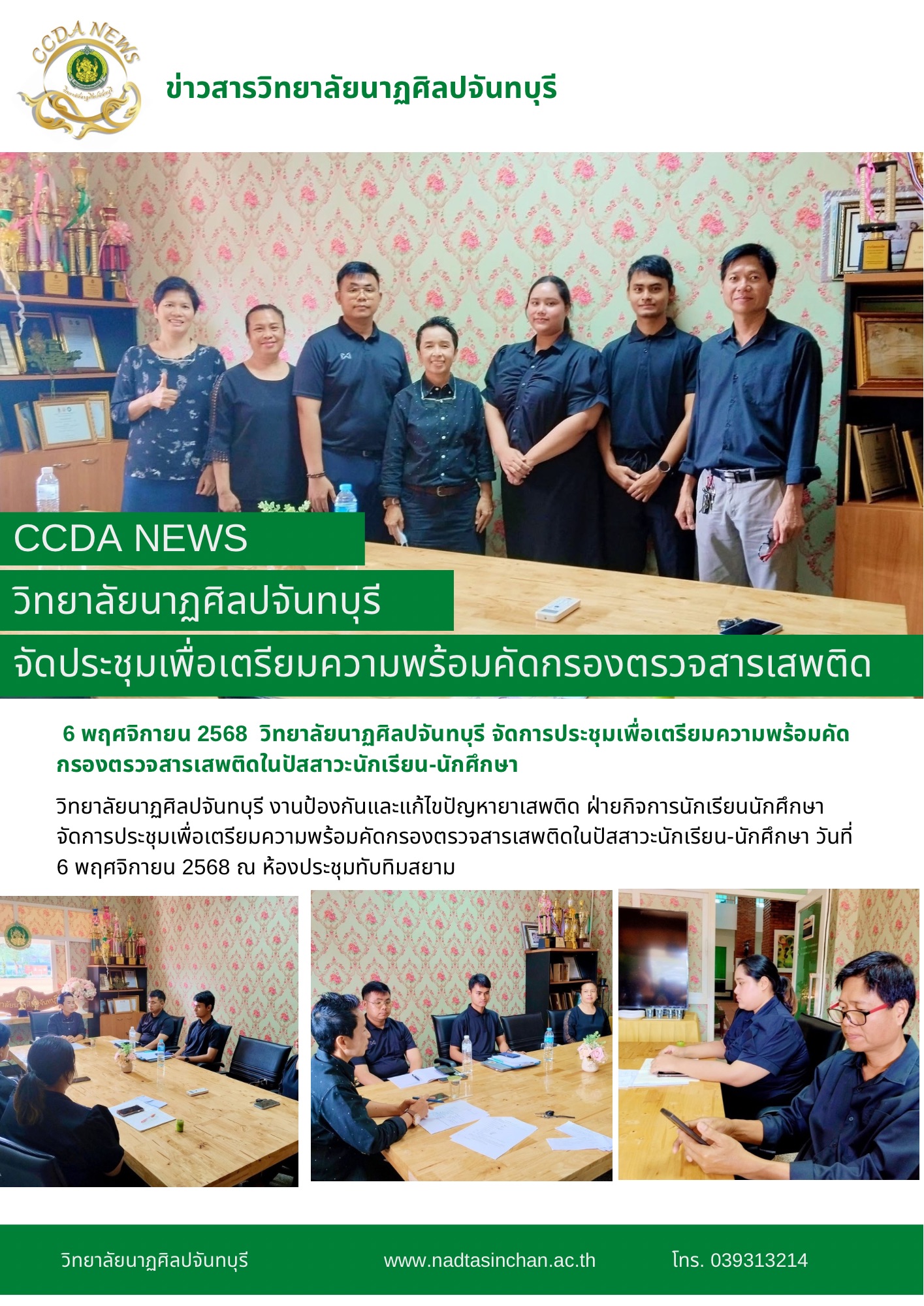 วิทยาลัยนาฏศิลปจันทบุรี งานป้องกันและแก้ไขปัญหายาเสพติด ฝ่ายกิจการนักเรียนนักศึกษา จัดการประชุมเพื่อเตรียมความพร้อมคัดกรองตรวจสารเสพติดในปัสสาวะนักเรียน-นักศึกษา วันที่ 6 พฤศจิกายน 2568 ณ ห้องประชุมทับทิมสยาม