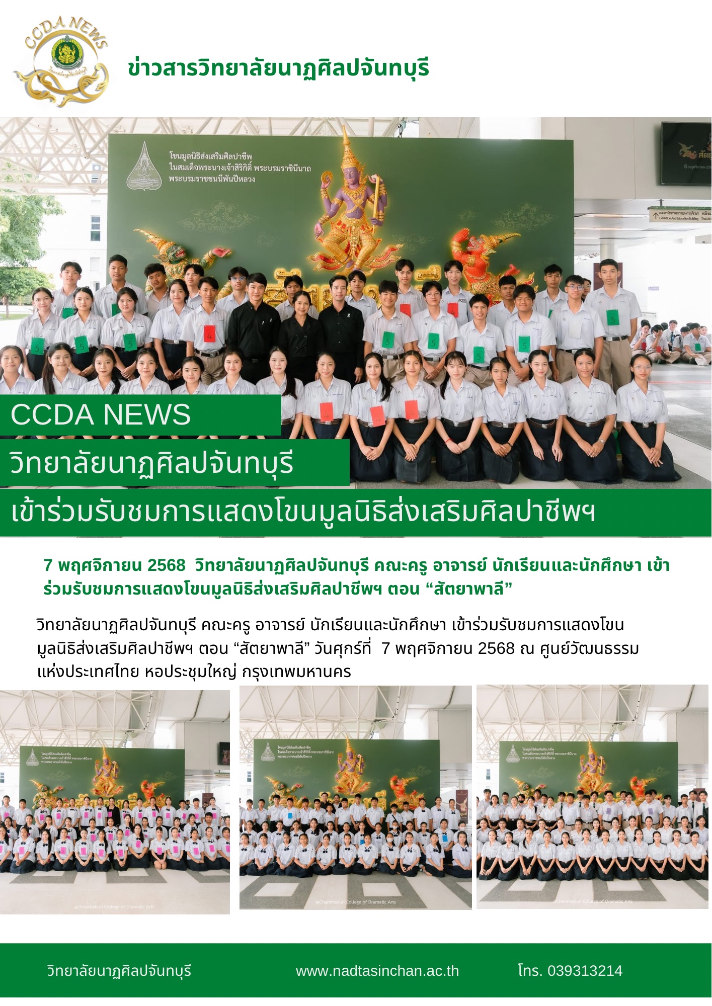 วิทยาลัยนาฏศิลปจันทบุรี คณะครู อาจารย์ นักเรียนและนักศึกษา เข้าร่วมรับชมการแสดงโขนมูลนิธิส่งเสริมศิลปาชีพฯ ตอน “สัตยาพาลี” วันศุกร์ที่ 7 พฤศจิกายน 2568 ณ ศูนย์วัฒนธรรมแห่งประเทศไทย หอประชุมใหญ่ กรุงเทพมหานคร