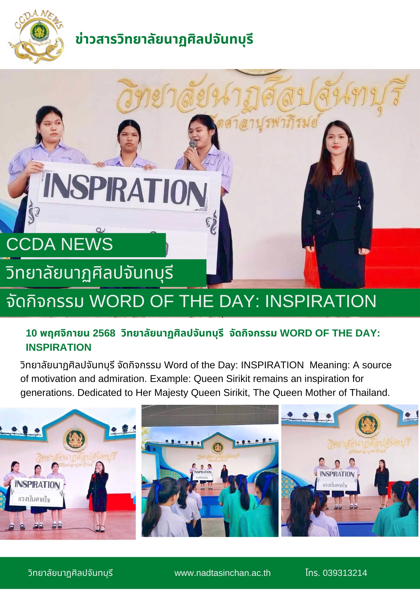 วิทยาลัยนาฏศิลปจันทบุรี จัดกิจกรรม Word of the Day: INSPIRATION Meaning: A source of motivation and admiration. Example: Queen Sirikit remains an inspiration for generations. Dedicated to Her Majesty