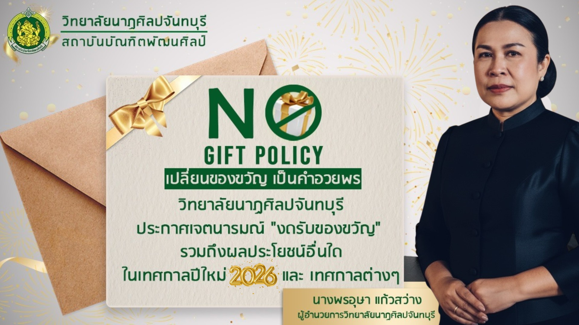 ?วิทยาลัยนาฏศิลปจันทบุรี ประกาศเจตนารมณ์ "งดรับของขวัญ" รวมถึงผลประโยชน์อื่นใด ในเทศกาลปีใหม่และ เทศกาลต่างๆ