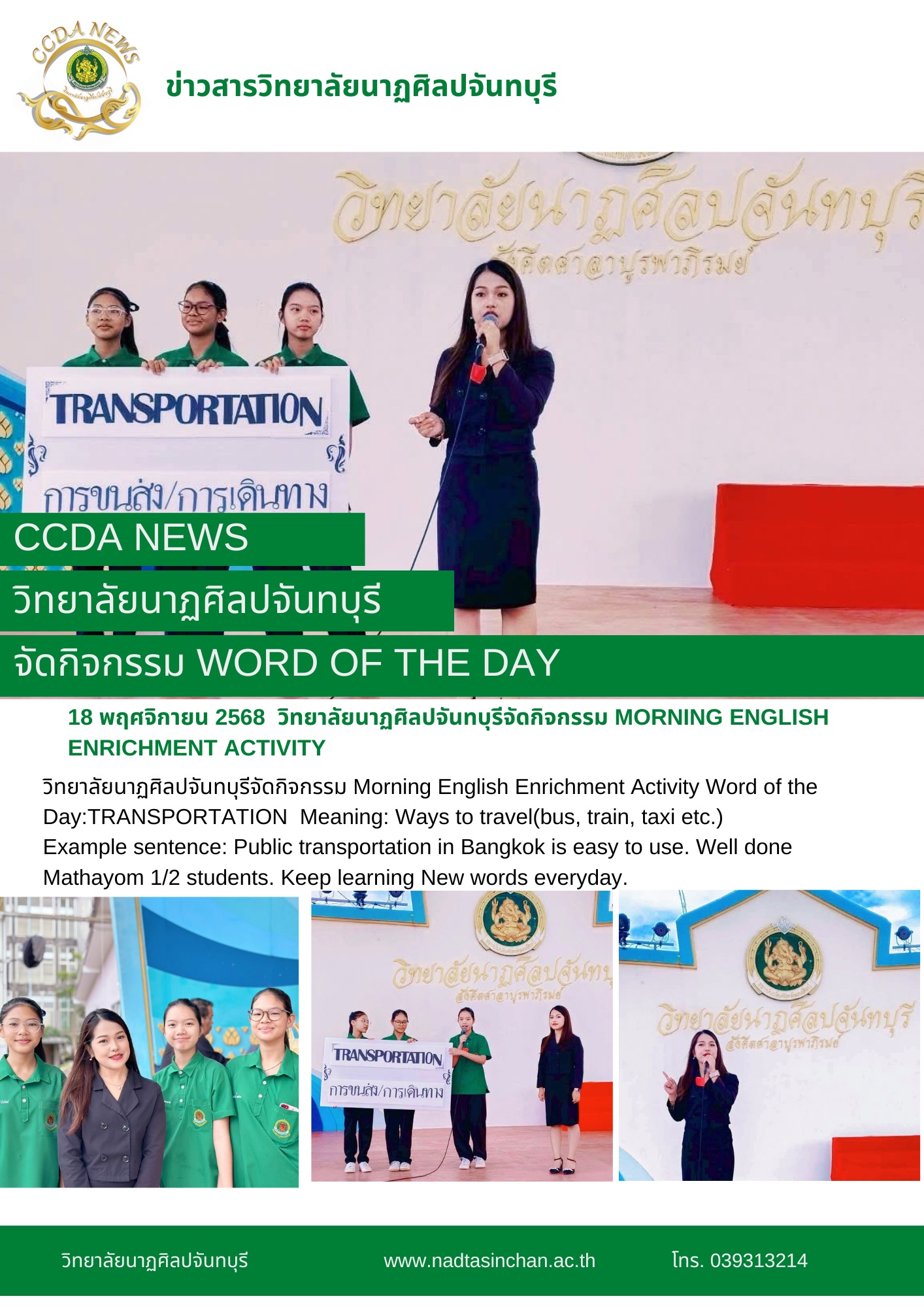วิทยาลัยนาฏศิลปจันทบุรีจัดกิจกรรม Morning English Enrichment Activity ( November 18,2025) Word of the Day: TRANSPORTATION
