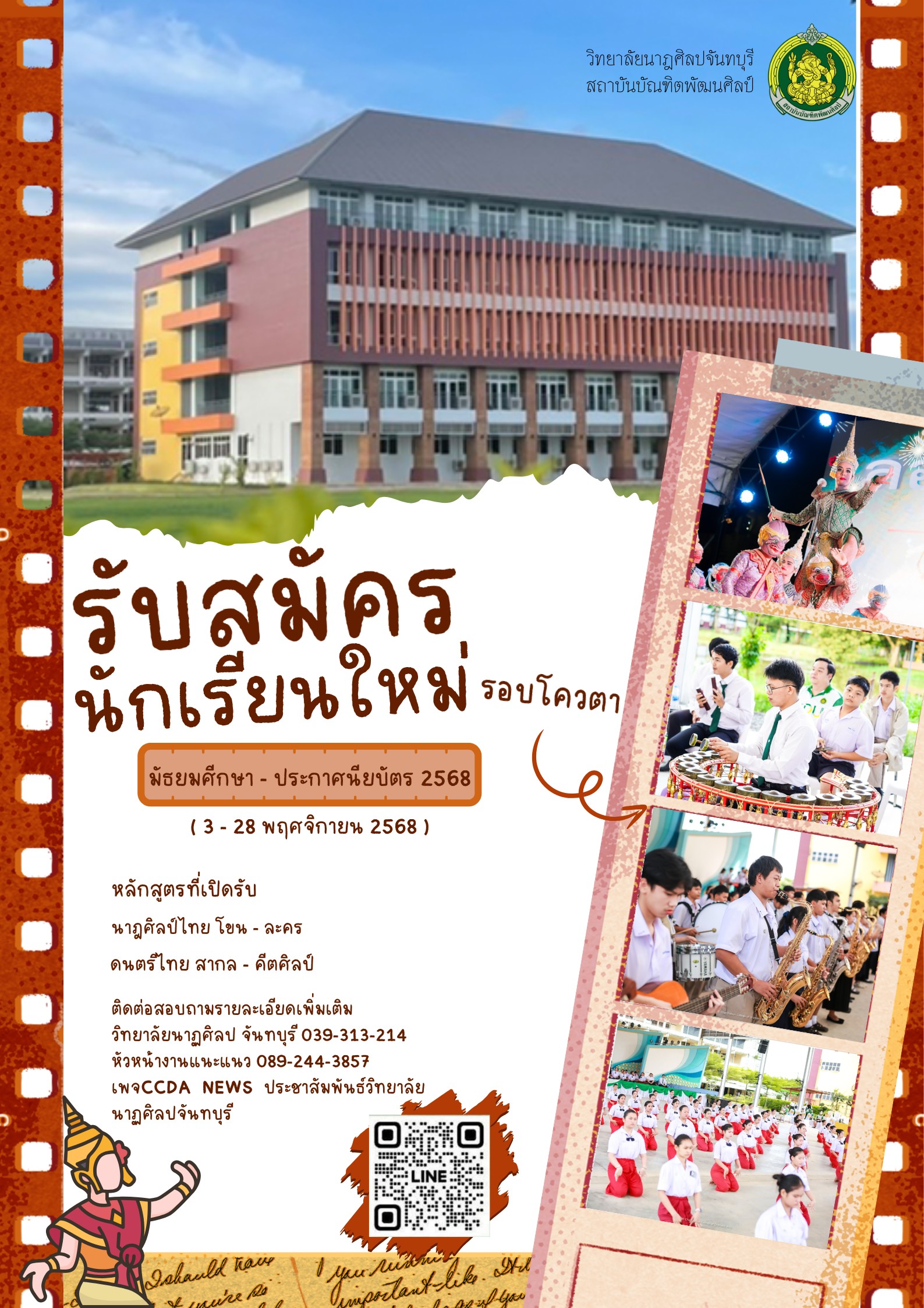 วิทยาลัยนาฏศิลปจันทบุรีประกาศรับสมัครนักเรียนเพื่อศึกษาต่อในระดับชั้นมัธยมศึกษาปีที่ 1 และ ประกาศนียบัตรวิชาชีพปีที่ 1 ปีการศึกษา 2569