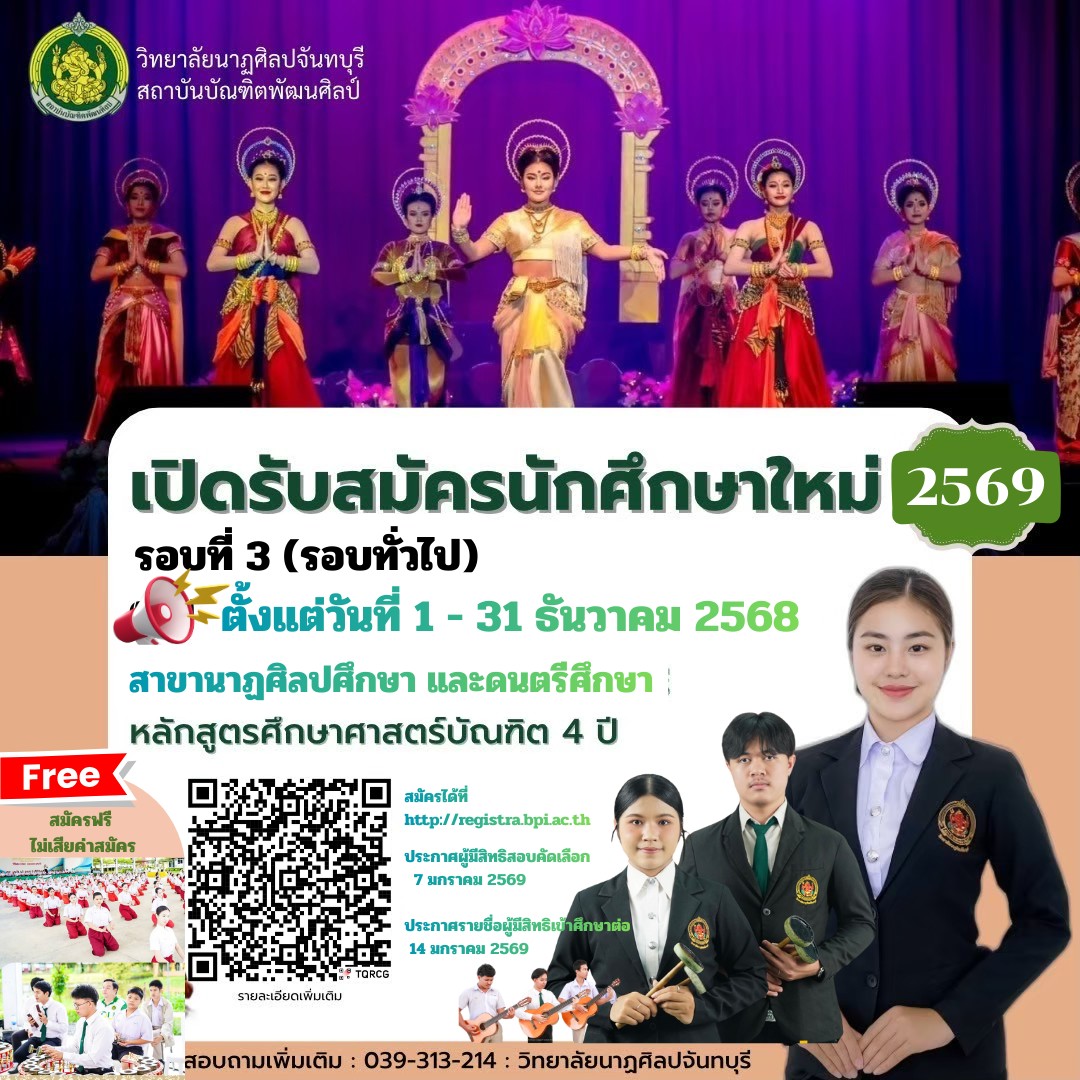 วิทยาลัยนาฏศิลปจันทบุรี สถาบันบัณฑิตพัฒนศิลป์ กำหนดรับสมัครนักศึกษาเข้าศึกษาต่อในระดับปริญญาตรี ปีการศึกษา ๒๕๖๙ (รอบที่ ๓ รอบทั่วไป)