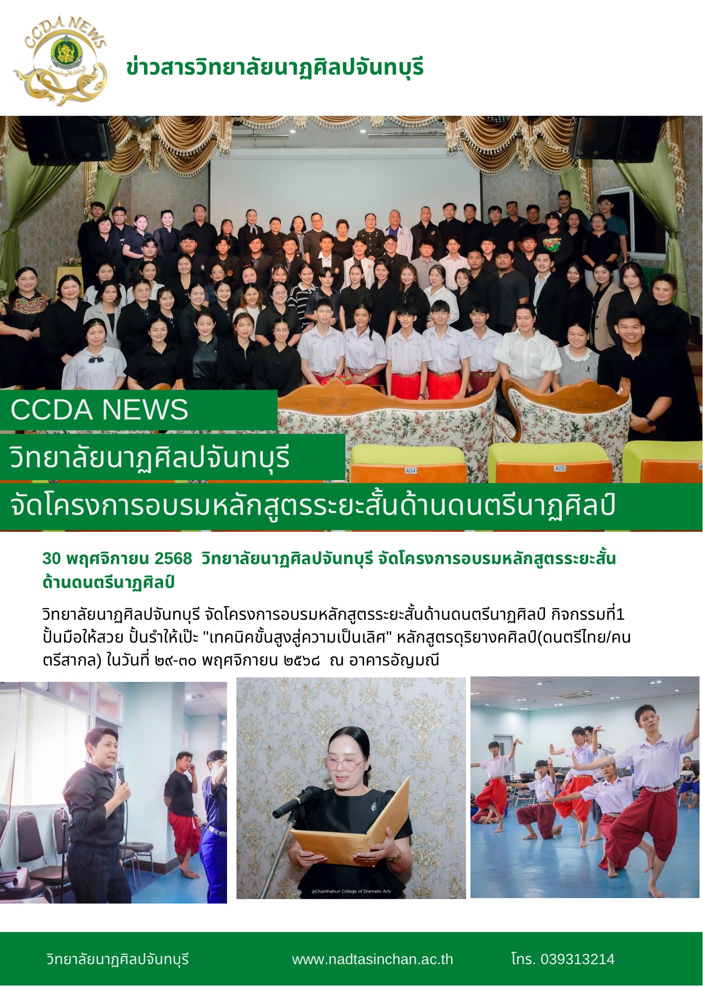 วิทยาลัยนาฏศิลปจันทบุรี จัดโครงการอบรมหลักสูตรระยะสั้นด้านดนตรีนาฏศิลป์ กิจกรรมที่1 ปั้นมือให้สวย ปั้นรำให้เป๊ะ "เทคนิคขั้นสูงสู่ความเป็นเลิศ" หลักสูตรดุริยางคศิลป์(ดนตรีไทย/คนตรีสากล) ในวันที่ ๒๙-๓๐ พฤศจิกายน ๒๕๖๘ ณ อาคารอัญมณี