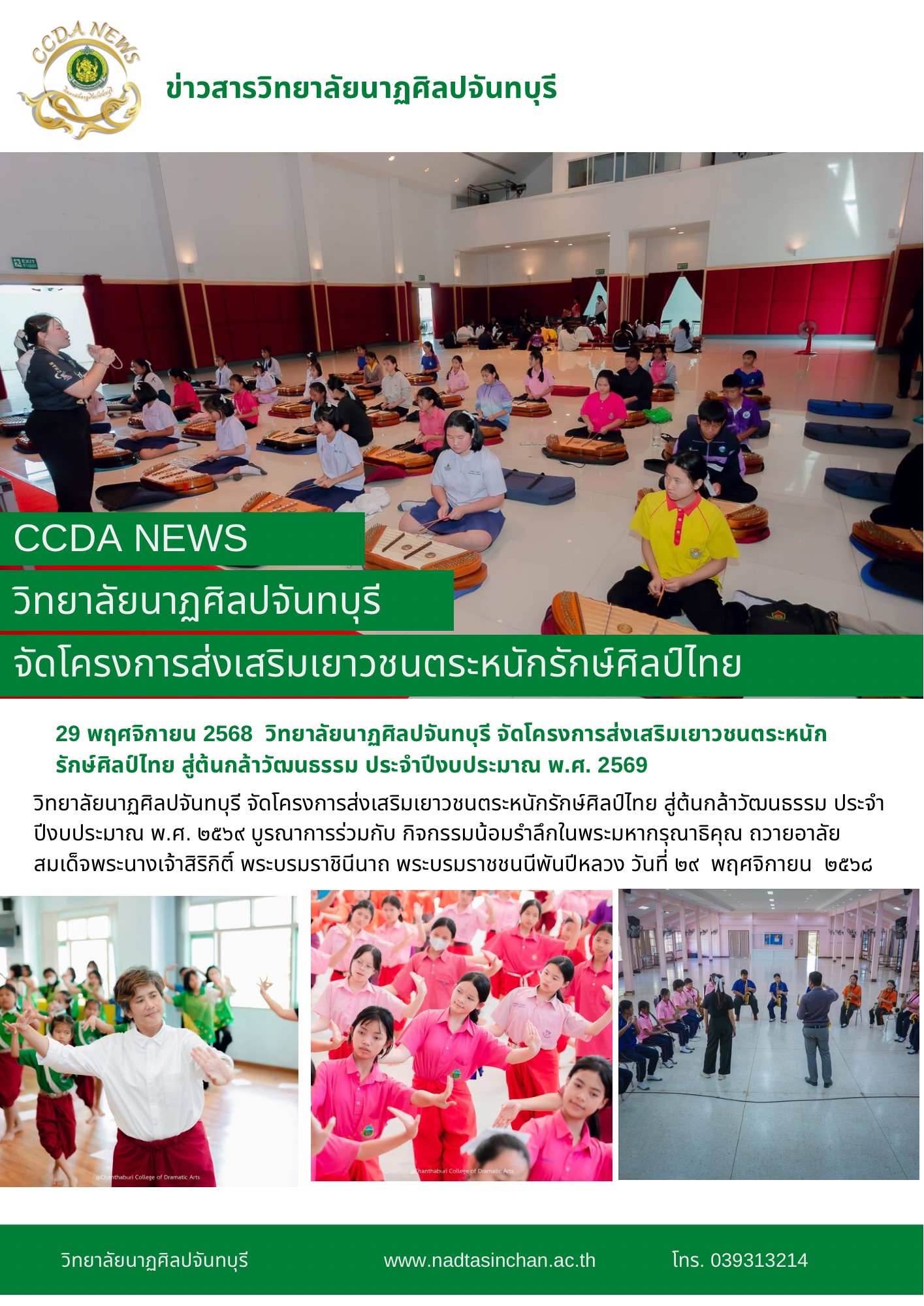 ?วิทยาลัยนาฏศิลปจันทบุรี จัดโครงการส่งเสริมเยาวชนตระหนักรักษ์ศิลป์ไทย สู่ต้นกล้าวัฒนธรรม ประจำปีงบประมาณ พ.ศ. ๒๕๖๙ บูรณาการร่วมกับ กิจกรรมน้อมรำลึกในพระมหากรุณาธิคุณ ถวายอาลัยสมเด็จพระนางเจ้าสิริกิติ์