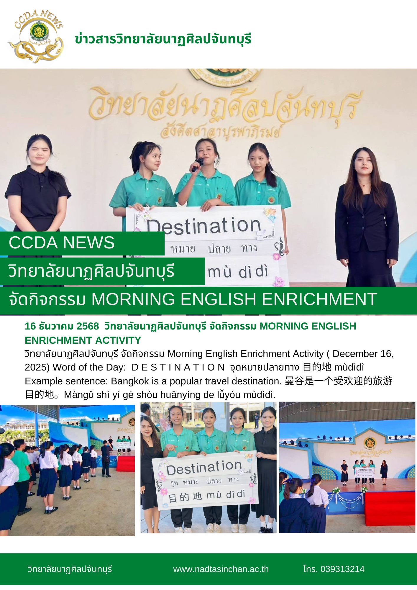 วิทยาลัยนาฏศิลปจันทบุรี จัดกิจกรรม Morning English Enrichment Activity ( December 16, 2025) Word of the Day: D E S T I N A T I O N จุดหมายปลายทาง m?d?d? Example sentence: Bangkok is a popular travel