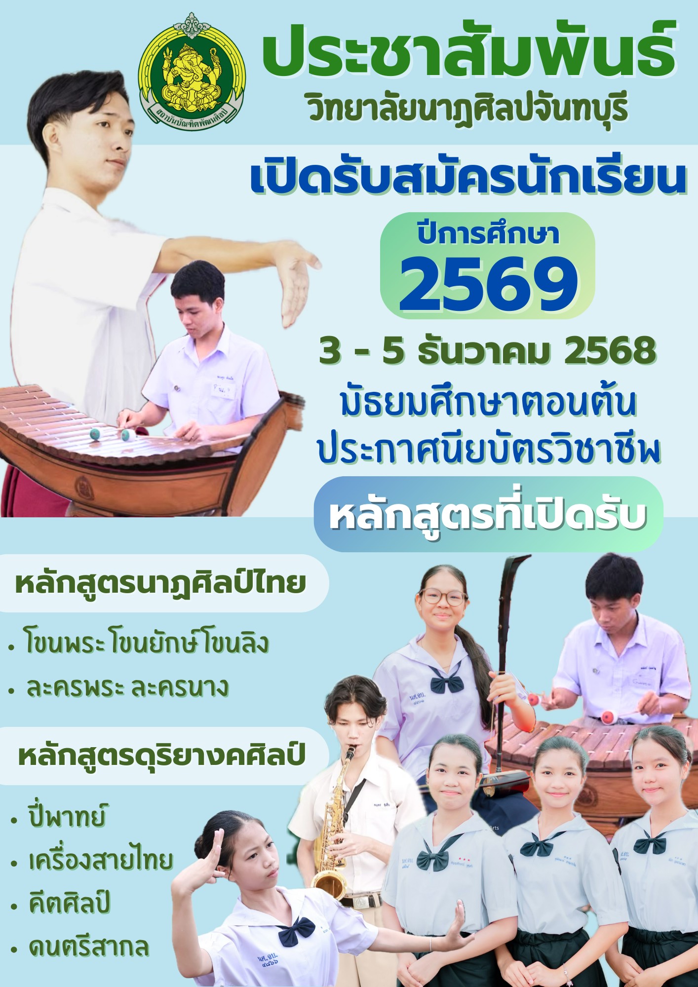 วิทยาลัยนาฏศิลปจันทบุรีประกาศรับสมัครนักเรียนเพื่อศึกษาต่อในระดับชั้นมัธยมศึกษาปีที่ 1 และ ประกาศนียบัตรวิชาชีพปีที่ 1 ปีการศึกษา 2569 (รอบทั่วไป)