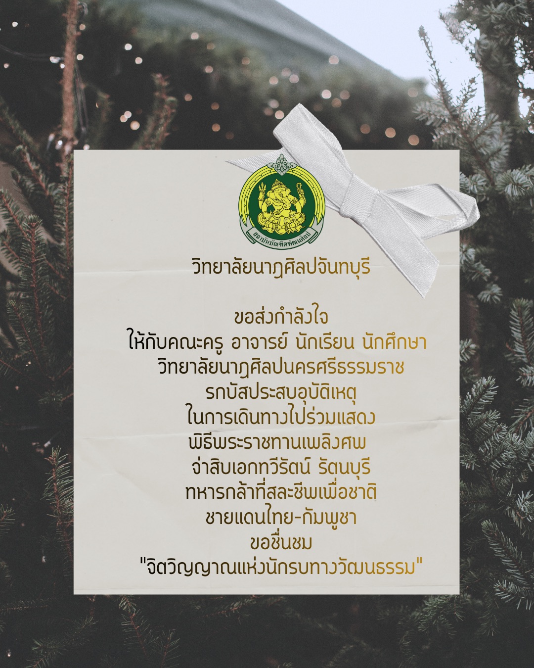 วิทยาลัยนาฏศิลปจันทบุรี ขอส่งกำลังใจให้กับคณะครู อาจารย์ นักเรียน นักศึกษา วิทยาลัยนาฏศิลปนครศรีธรรมราช รถบัสประสบอุบัติเหตุ ในการเดินทางไปร่วมแสดงพิธีพระราชทานเพลิงศพ จ่าสิบเอกทวีรัตน์ รัตนบุรี ทหาร
