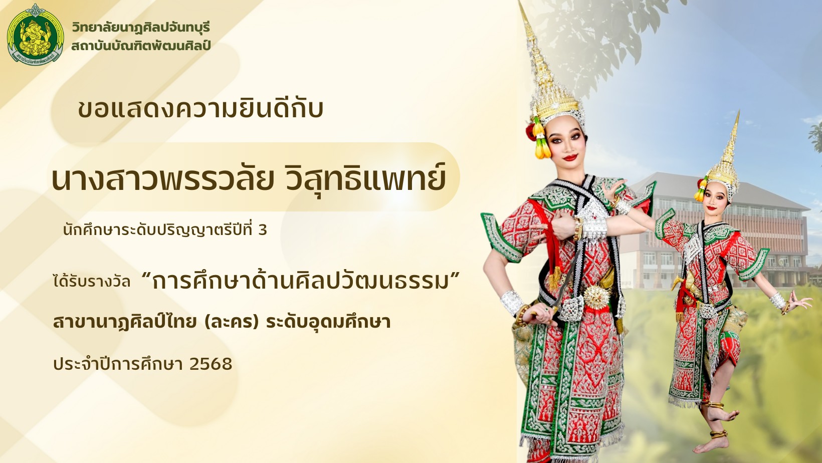 วิทยาลัยนาฏศิลปจันทบุรี สถาบันบัณฑิตพัฒนศิลป์ ขอแสดงความยินดีกับนักศึกษาระดับปริญญาตรี ในโอกาสได้รับรางวัล "การศึกษาด้านศิลปวัฒนธรรม" สาขานาฎศิลป์ไทย (ละคร) ระดับอุดมศึกษา ประจำปีการศึกษา 2568