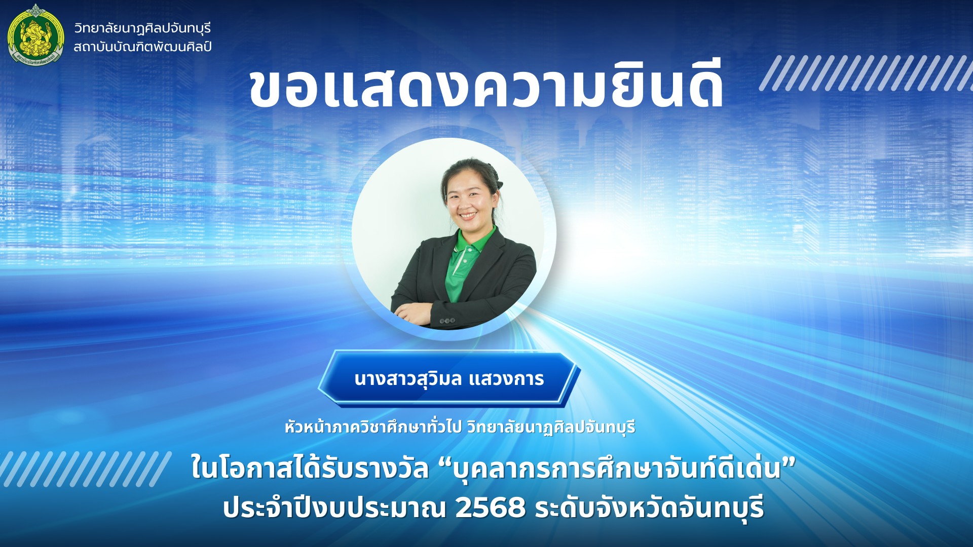 วิทยาลัยนาฏศิลปจันทบุรี สถาบันบัณฑิตพัฒนศิลป์ ขอแสดงความยินดีกับ นางสาวสุวิมล แสวงการ ในโอกาสได้รับรางวัล "บุคลากรการศึกษาจันท์ดีเด่น" ประจำปีงบประมาณ 25668 ระดับจังหวัดจันทบุรี