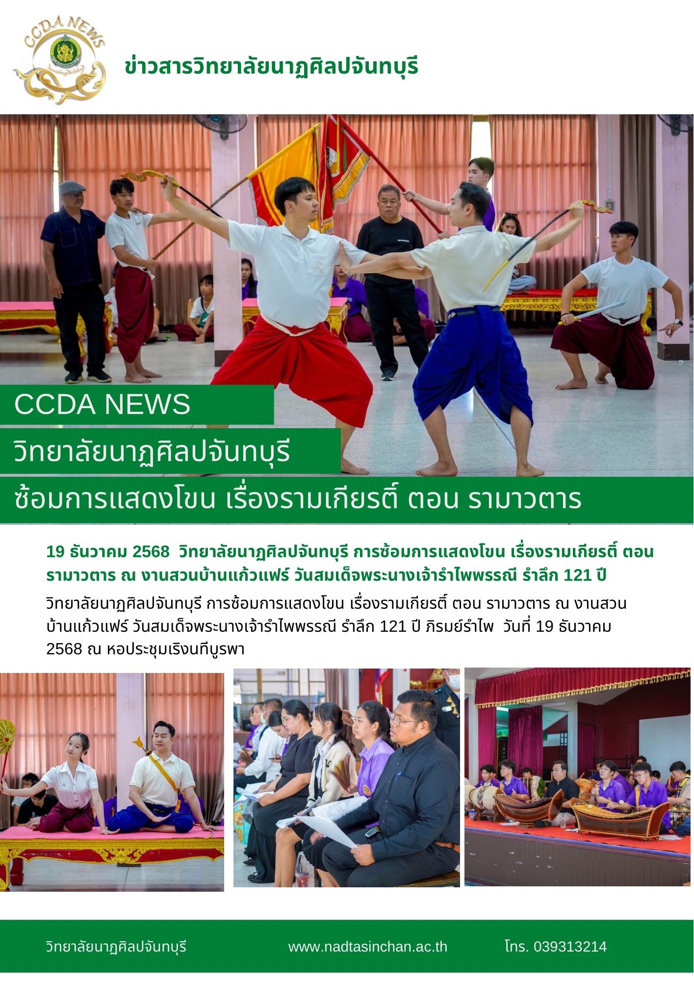 วิทยาลัยนาฏศิลปจันทบุรี การซ้อมการแสดงโขน เรื่องรามเกียรติ์ ตอน รามาวตาร ณ งานสวนบ้านแก้วแฟร์ วันสมเด็จพระนางเจ้ารำไพพรรณี รำลึก 121 ปี ภิรมย์รำไพ  วันที่ 19 ธันวาคม 2568 ณ หอประชุมเริงนทีบูรพา รับชมภาพเพิ่มเติม>>https://drive.google.com/drive/folders/10yodqW1xxk3rh8dAQOw9qsbXGeZjR89b?usp=sharing