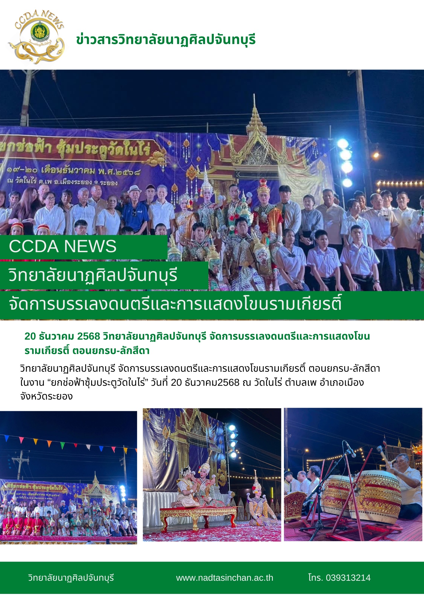 วิทยาลัยนาฏศิลปจันทบุรี จัดการบรรเลงดนตรีและการแสดงโขนรามเกียรติ์ ตอนยกรบ-ลักสีดา ในงาน “ยกช่อฟ้าซุ้มประตูวัดในไร่” วันที่ 20 ธันวาคม2568 ณ วัดในไร่ ตำบลเพ อำเภอเมือง จังหวัดระยอง