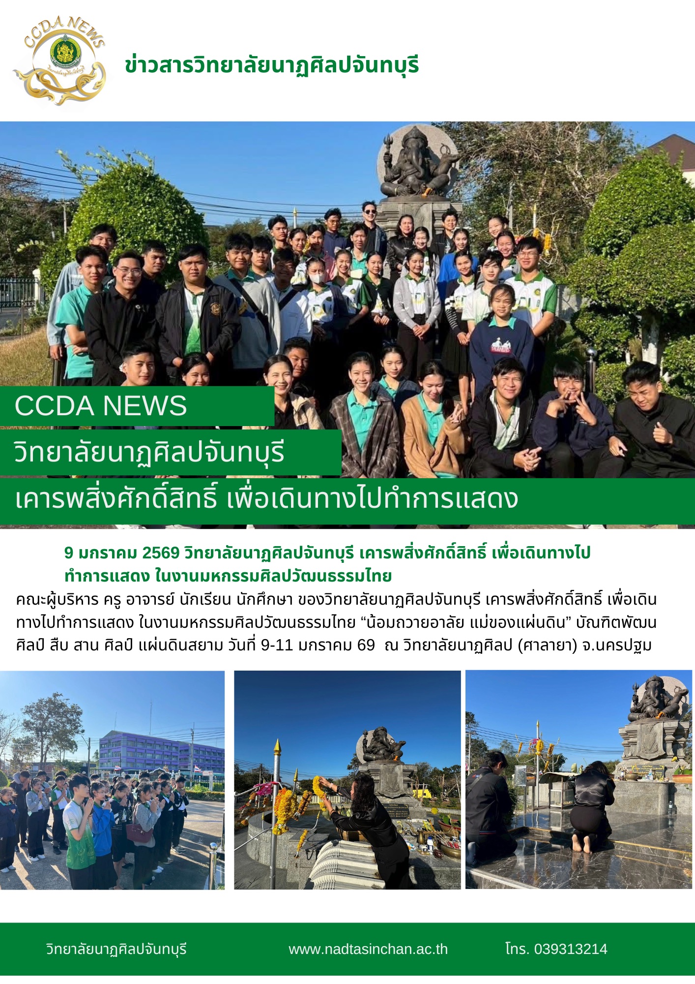 คณะผู้บริหาร ครู อาจารย์ นักเรียน นักศึกษา ของวิทยาลัยนาฏศิลปจันทบุรี เคารพสิ่งศักดิ์สิทธิ์ เพื่อเดินทางไปทำการแสดง ในงานมหกรรมศิลปวัฒนธรรมไทย “น้อมถวายอาลัย แม่ของแผ่นดิน” บัณฑิตพัฒนศิลป์ สืบ สาน ศิลป์ แผ่นดินสยาม วันที่ 9-11 มกราคม 69 ณ วิทยาลัยนาฏศิลป (ศาลายา) จ.นครปฐม