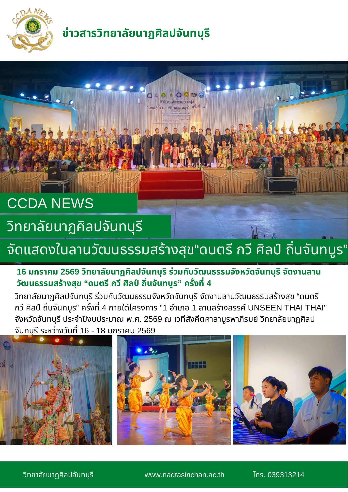 วิทยาลัยนาฏศิลปจันทบุรี ร่วมกับวัฒนธรรมจังหวัดจันทบุรี จัดงานลานวัฒนธรรมสร้างสุข “ดนตรี กวี ศิลป์ ถิ่นจันทบูร” ครั้งที่ 4 ภายใต้โครงการ "1 อำเภอ 1 ลานสร้างสรรค์ UNSEEN THAI THAI" จังหวัดจันทบุรี ประจำปีงบประมาณ พ.ศ. 2569 ณ เวทีสังคีตศาลาบูรพาภิรมย์ วิทยาลัยนาฏศิลปจันทบุรี ระหว่างวันที่ 16 - 18 มกราคม 2569  รับชมภาพเพิ่มเติม>>