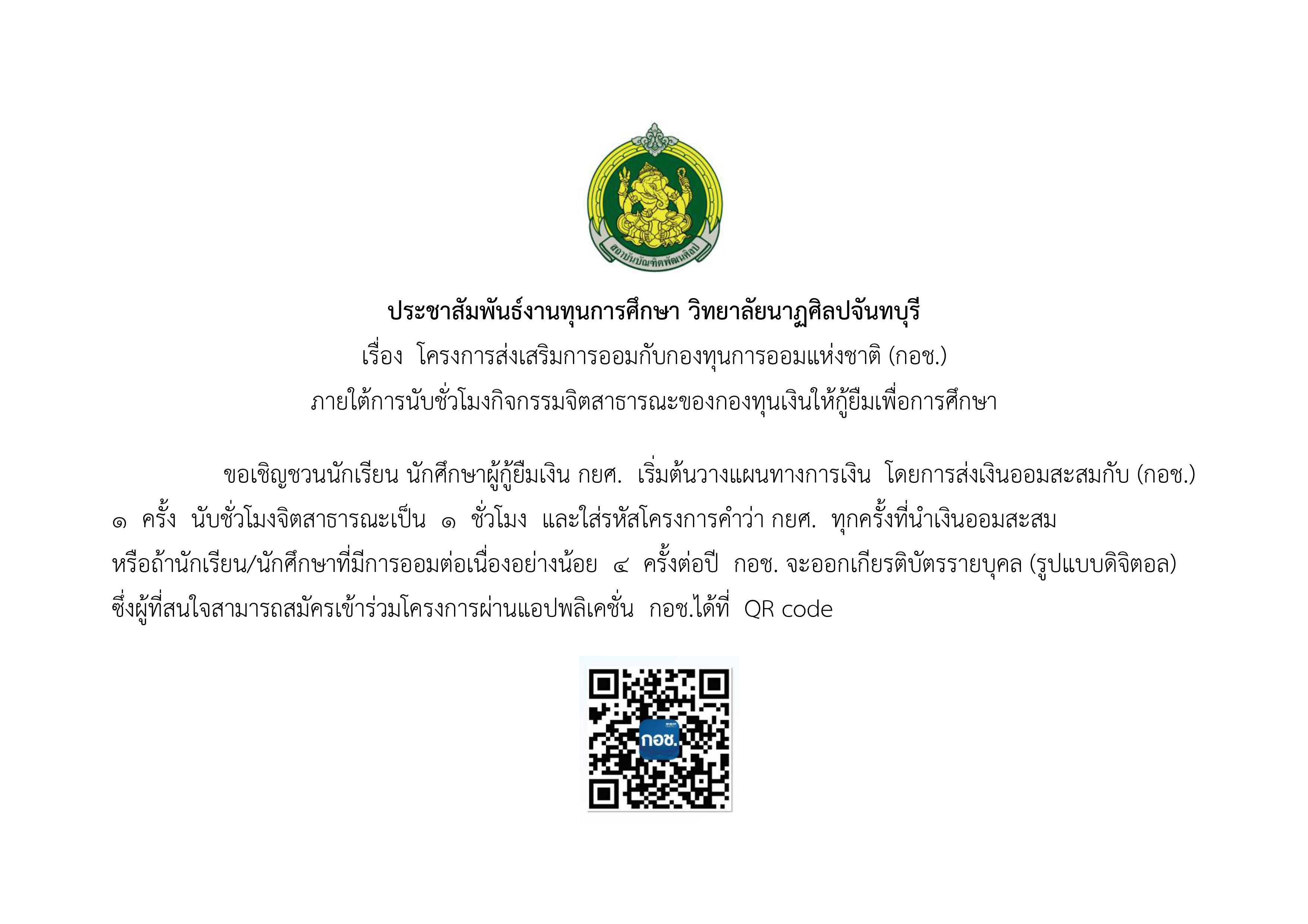 ขอเชิญชวนนักเรียน นักศึกษาผู้กู้ยืมเงิน กยศ. เริ่มต้นวางแผนทางการเงิน โดยการส่งเงินออมสะสมกับ (กอช.) 1 ครั้ง นับชั่วโมงจิตสาธารณะเป็น 1 ชั่วโมง และใส่รหัสโครงการคำว่า กยศ. ทุกครั้งที่นำเงินออมสะสม