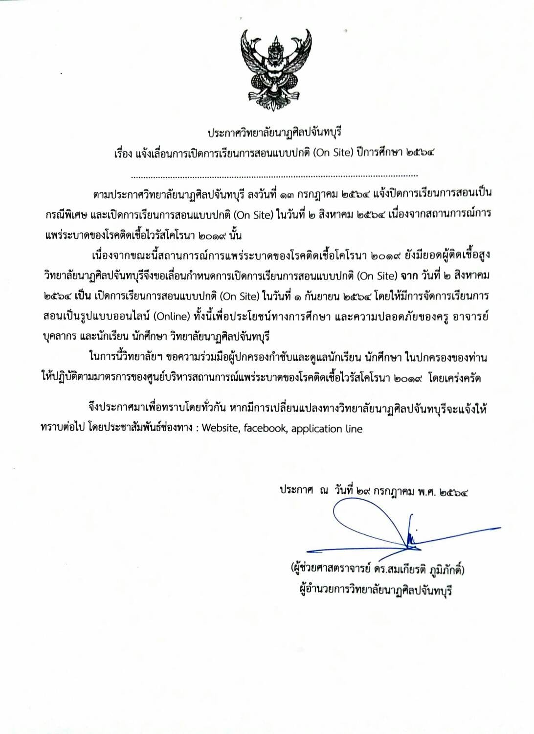 วิทยาลัยนาฏศิลปจันทบุรีจึงขอเลื่อนกำหนดการเปิดการเรียนการสอนแบบปกติ (On Site)