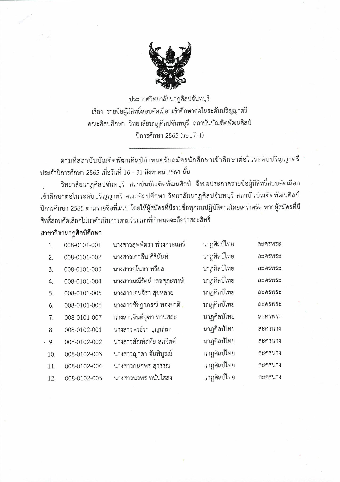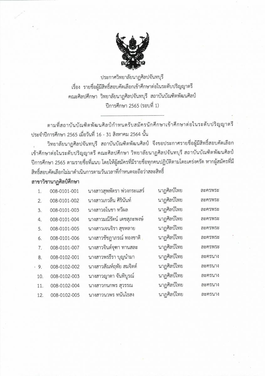 วิทยาลัยนาฎศิลปจันทบุรี สถาบันบัณฑิตพัฒศิลป์ ปีการศึกษา 2565 (รอบที่ 1) ประจำปีการศึกษา 2565