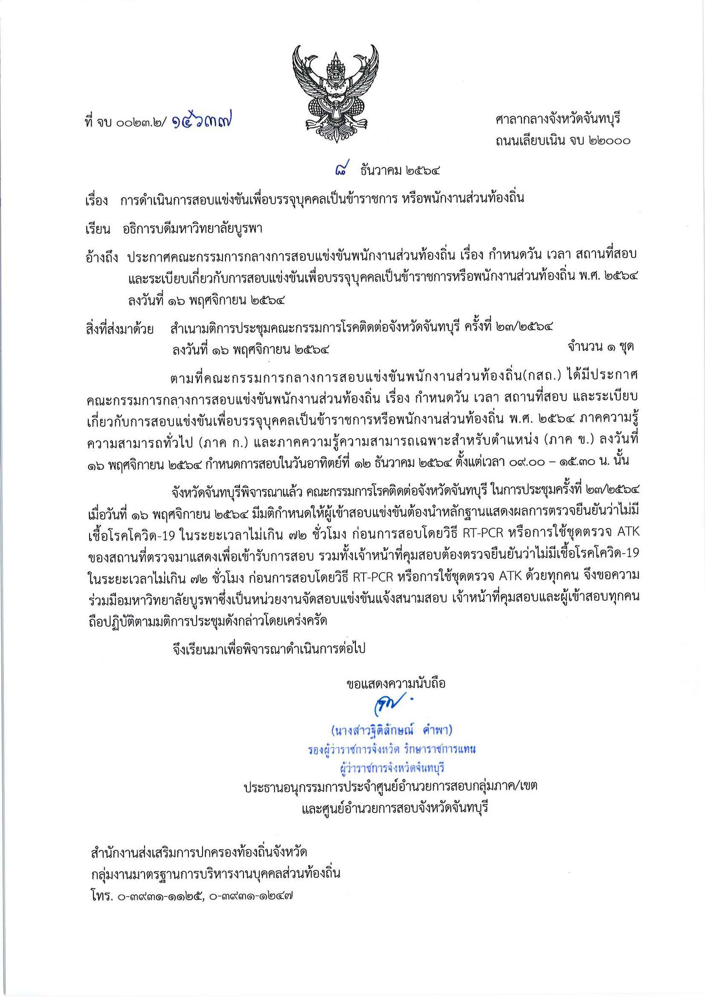 จังหวัดจันทบุรีพิจารณาแล้ว คณะกรรมการโรคติดต่อจังหวัดจันทบุรี ในการประชุมครั้งที่ ๒๓/๒๕๖๔ มื่อวันที่ ๑๖ พฤศจิกายน ๒๕๖๔ มีมติกำหนดให้ผู้เข้าสอบแข่งขันต้องนำหลักฐานแสดงผลการตรวจยืนยันว่าไม่มีเชื้อโรคโควิด-19 ในระยะเวลาไม่เกิน ๗๒ ชั่วโมง ก่อนการสอบโดยวิธี RT-PCR หรือการใช้ชุดตรวจ ATK ของสถานที่ตรวจ มาแสดงเพื่อเข้ารับการสอบ รวมทั้งเจ้าหน้าที่คุมสอบต้องตรวจยืนยันว่าไม่มีเชื้อโรคโควิด-19 ในระยะเวลาไม่เกิน ๗๒ ชั่วโมง ก่อนการสอบโดยวิธี RT-PCR หรือการใช้ชุดตรวจ ATK ด้วยทุกคน จึงขอความร่วมมือมหาวิทยาลัยบูรพาซึ่งเป็นหน่วยงานจัดสอบแข่งขันแจ้งสนามสอบ เจ้าหน้าที่คุมสอบและผู้เข้าสอบทุกคน ถือปฏิบัติตามมติการประชุมดังกล่าวโดยเคร่งครัด