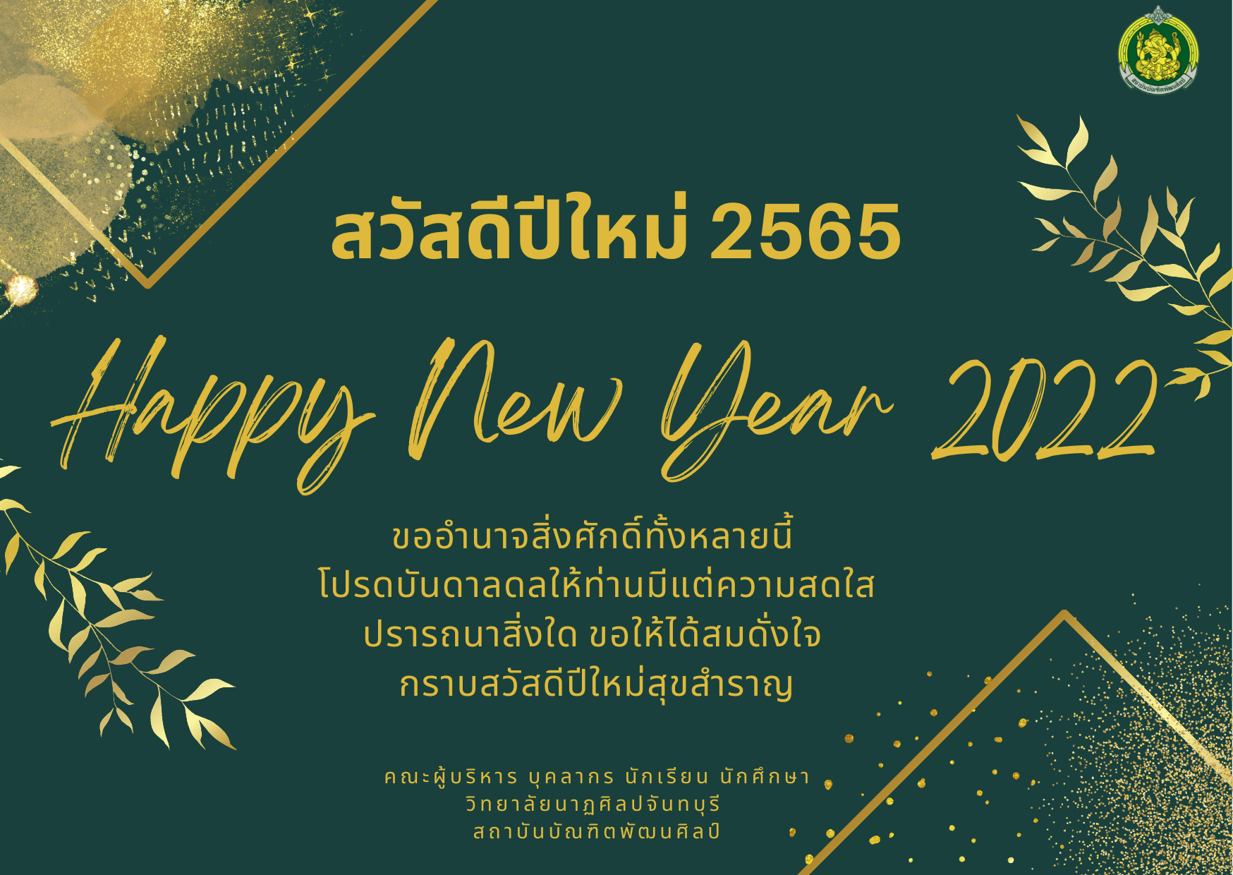 สวัสดีปีไหม่ 2565 Hhppy New year 2022 ขออำนาจสิ่งศักดิ์ทั้งหลายนี้ โปรดบันดาลดลให้ท่านมีแต่ความสดใส ปรารถนาสิ่งใด ขอให้ได้สมดั่งใจ กราบสวัสดีปีใหม่สุขสำราญ คณะผู้บริหาร บุคลากร นักเรียน นักศึกษา วิทยาลัยนาฏศิลปจันทบุรี สถาบันบัณฑิตพัฒนศิลป์