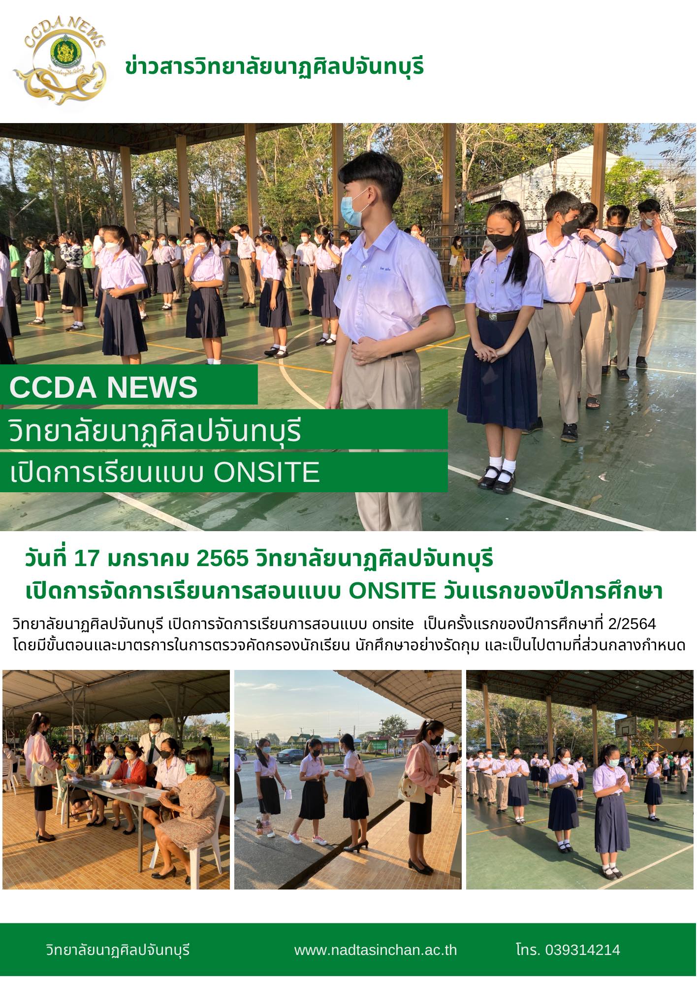 วันที่ 17 มกราคม 2565 วิทยาลัยนาฏศิลปจันทบุรี เปิดการจัดการเรียนการสอนแบบ onsite เป็นครั้งแรกของปีการศึกษาที่ 2/2564 โดยมีขั้นตอนและมาตรการในการตรวจคัดกรองนักเรียน นักศึกษาอย่างรัดกุม และเป็นไปตามที่ส่วนกลางกำหนด