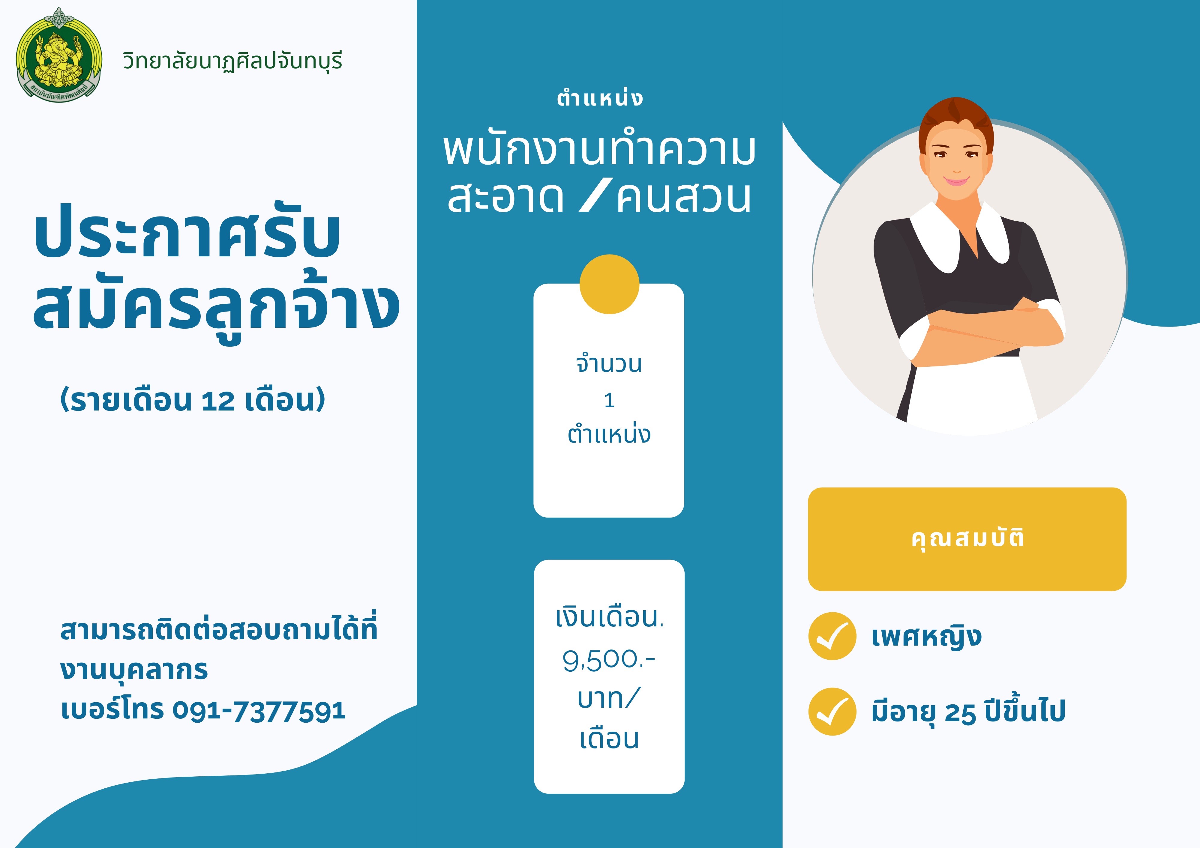ประกาศ รับสมัครลูกจ้าง (จ้างเหมาบริการรายเดือน) ตำแหน่ง พนักงานทำความสะอาด/คนสวน จำนวน 1 อัตรา