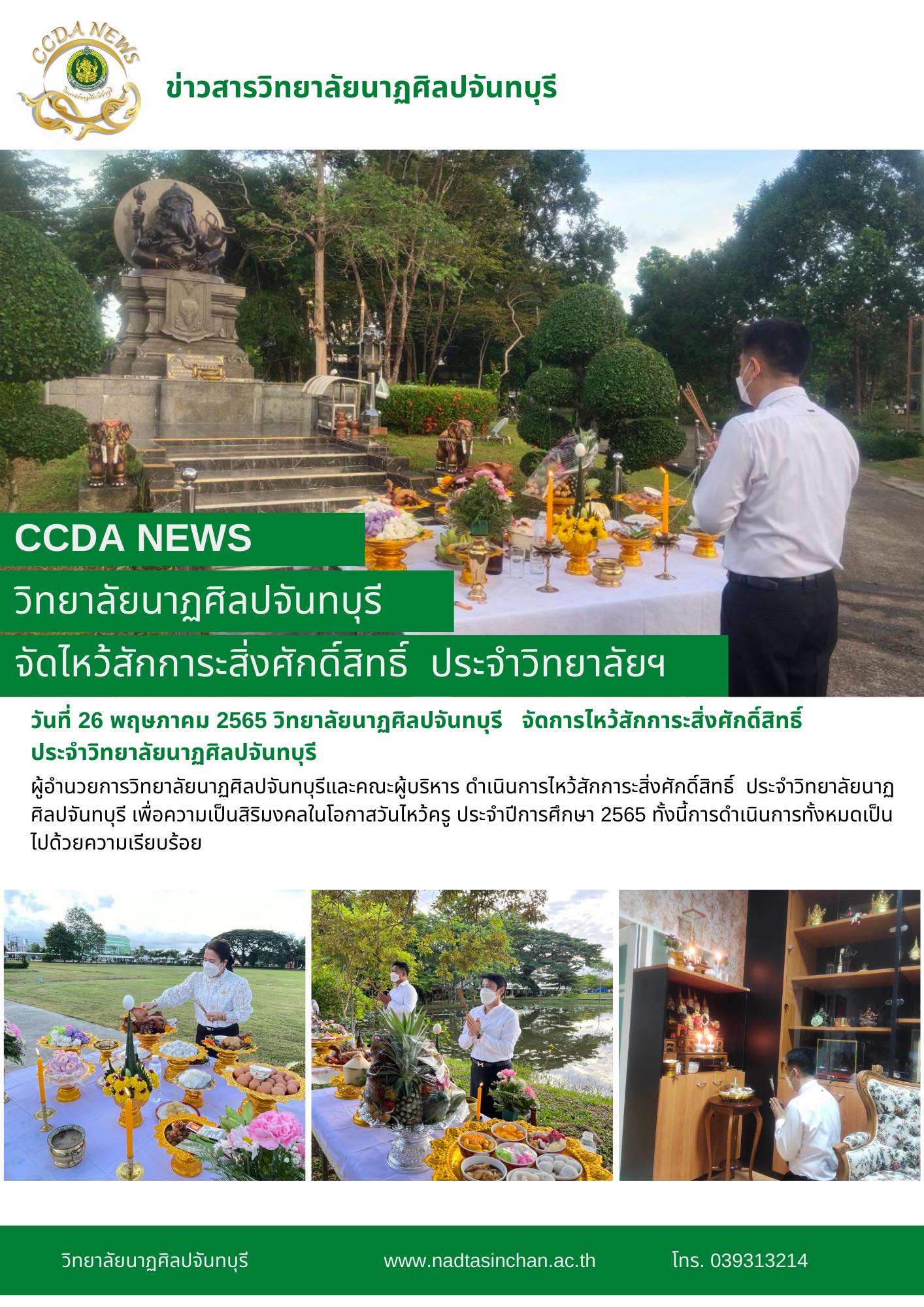 วันที่ 26 พฤษภาคม 2565 ผู้อำนวยการวิทยาลัยนาฏศิลปจันทบุรีและคณะผู้บริหาร ไหว้สักการะสิ่งศักดิ์สิทธิ์ ประจำวิทยาลัยนาฏศิลปจันทบุรี เพื่อความเป็นสิริมงคลในโอกาสวันไหว้ครู