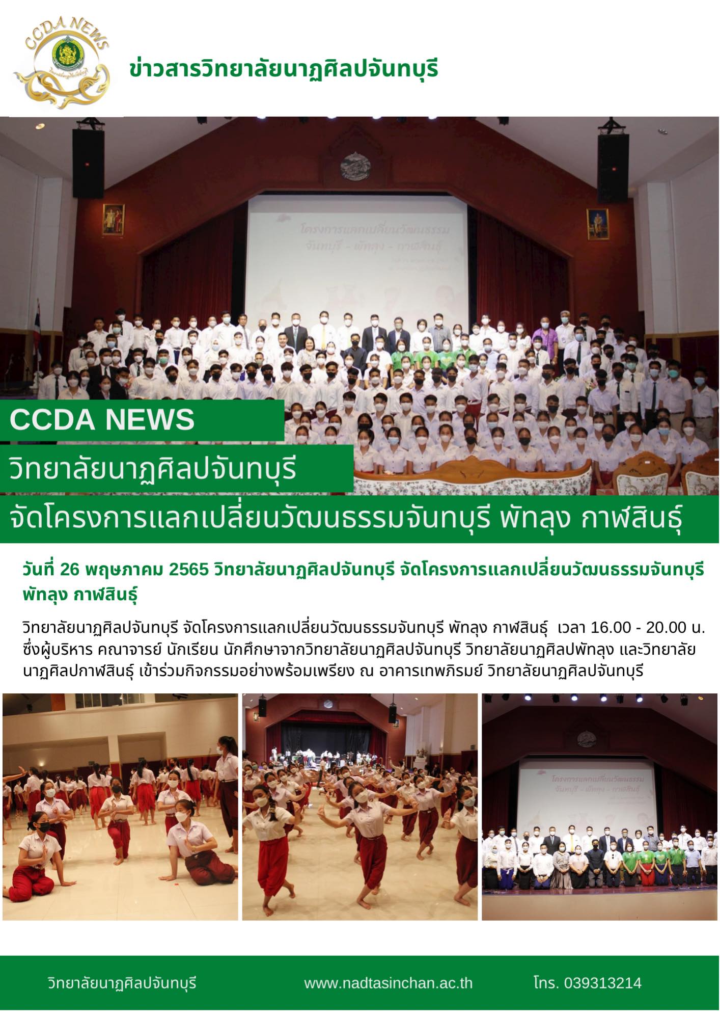 วิทยาลัยนาฏศิลปจันทบุรี จัดโครงการแลกเปลี่ยนวัฒนธรรมจันทบุรี พัทลุง กาฬสินธุ์ ในวันที่ 26 พฤษภาคม 2565 เวลา 16.00 - 20.00 น. ณ อาคารเทพภิรมย์ วิทยาลัยนาฏศิลปจันทบุรี