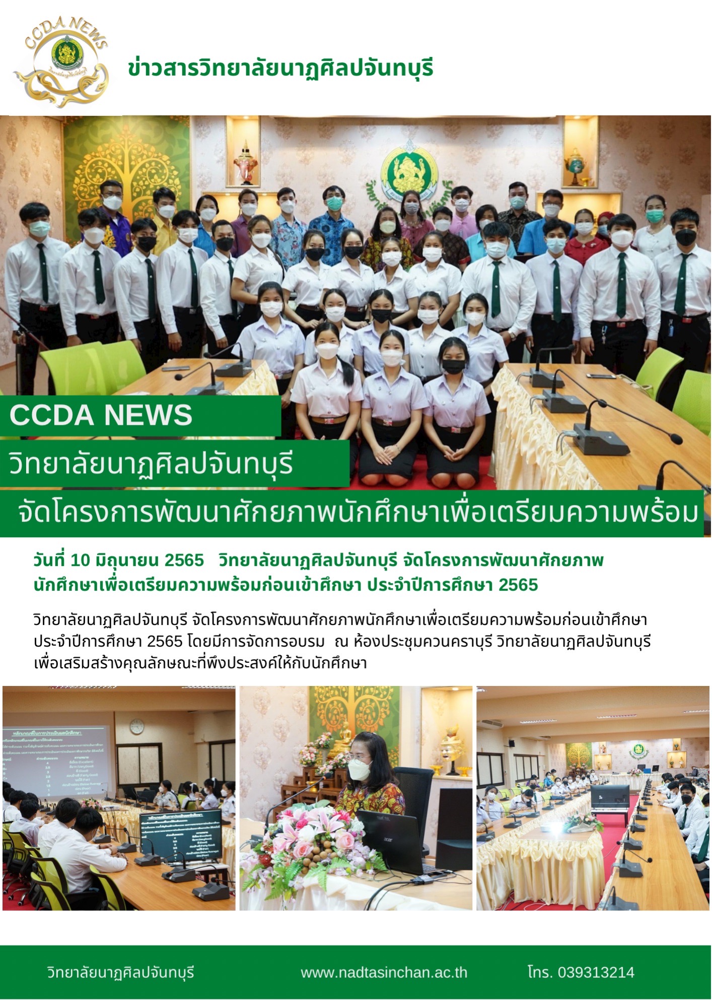 วิทยาลัยนาฏศิลปจันทบุรี จัดโครงการพัฒนาศักยภาพนักศึกษาเพื่อเตรียมความพร้อมก่อนเข้าศึกษา ประจำปีการศึกษา 2565 โดยมีการจัดการอบรม ในวันที่ 10 มิถุนายน 2565 ณ ห้องประชุมควนคราบุรี วิทยาลัยนาฏศิลปจันทบุรี เพื่อเสริมสร้างคุณลักษณะที่พึงประสงค์ให้กับนักศึกษา