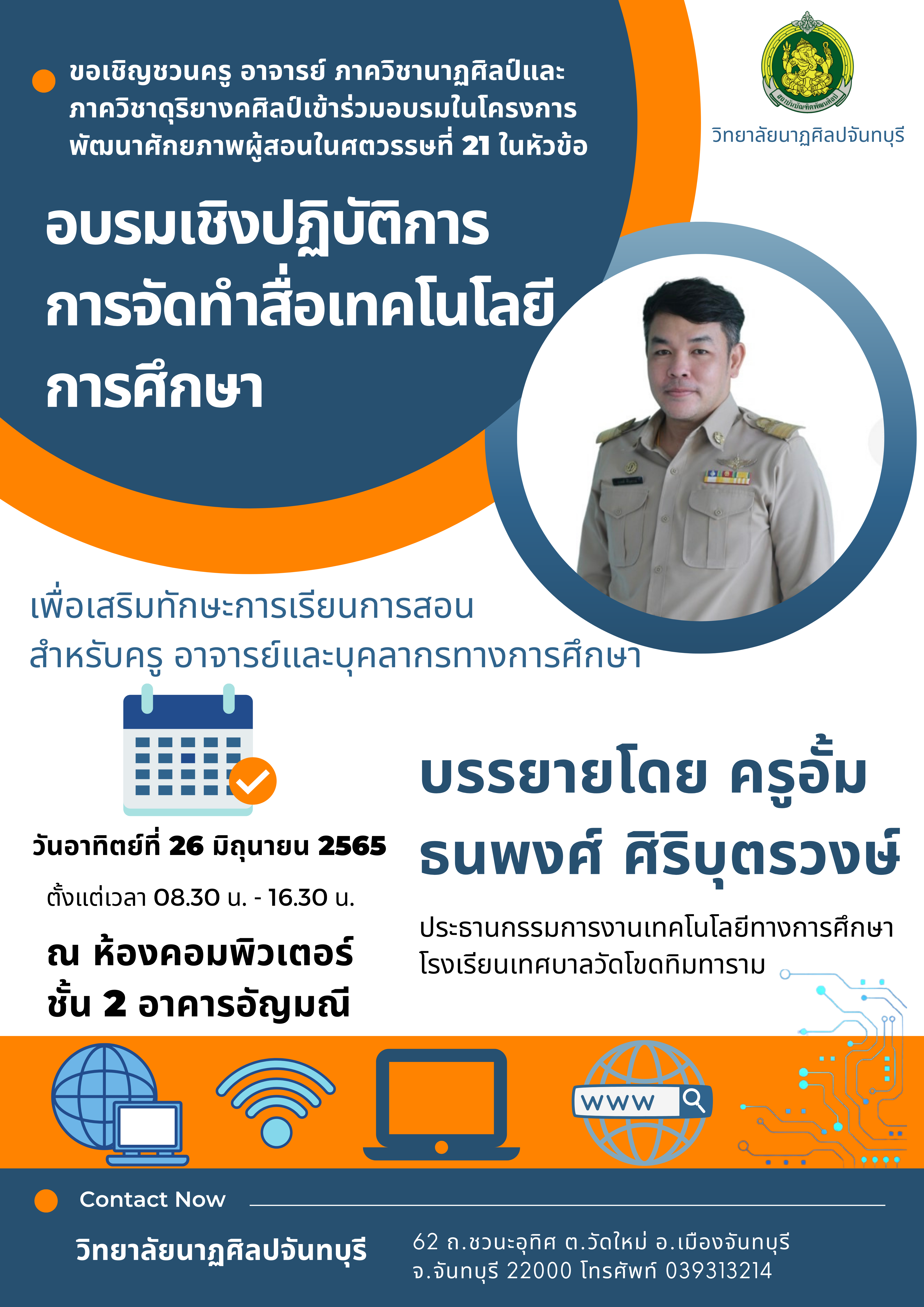 ขอเชิญชวนครู อาจารย์ ภาควิชานาฏศิลป์และภาควิชาดุริยางคศิลป์เข้าร่วมอบรมในโครงการพัฒนาศักยภาพผู้สอนในศตวรรษที่ 21 ในหัวข้อ อบรมเชิงปฏิบัติการการจัดทำสื่อเทคโนโลยีการศึกษา เพื่อเสริมทักษะการเรียนการสอน สำหรับครู อาจารย์และบุคลากรทางการศึกษา บรรยายโดย ครูอั้ม ธนพงศ์ ศิริบุตรวงษ์ ประธานกรรมการงานเทคโนโลยีทางการศึกษา โรงเรียนเทศบาลวัดโขดทิมทาราม ในวันอาทิตย์ที่ 26 มิถุนายน 2565 ตั้งแต่เวลา 08.30 น. - 16.30 น. ณ ห้องคอมพิวเตอร์ ชั้น 2 อาคารอัญมณี