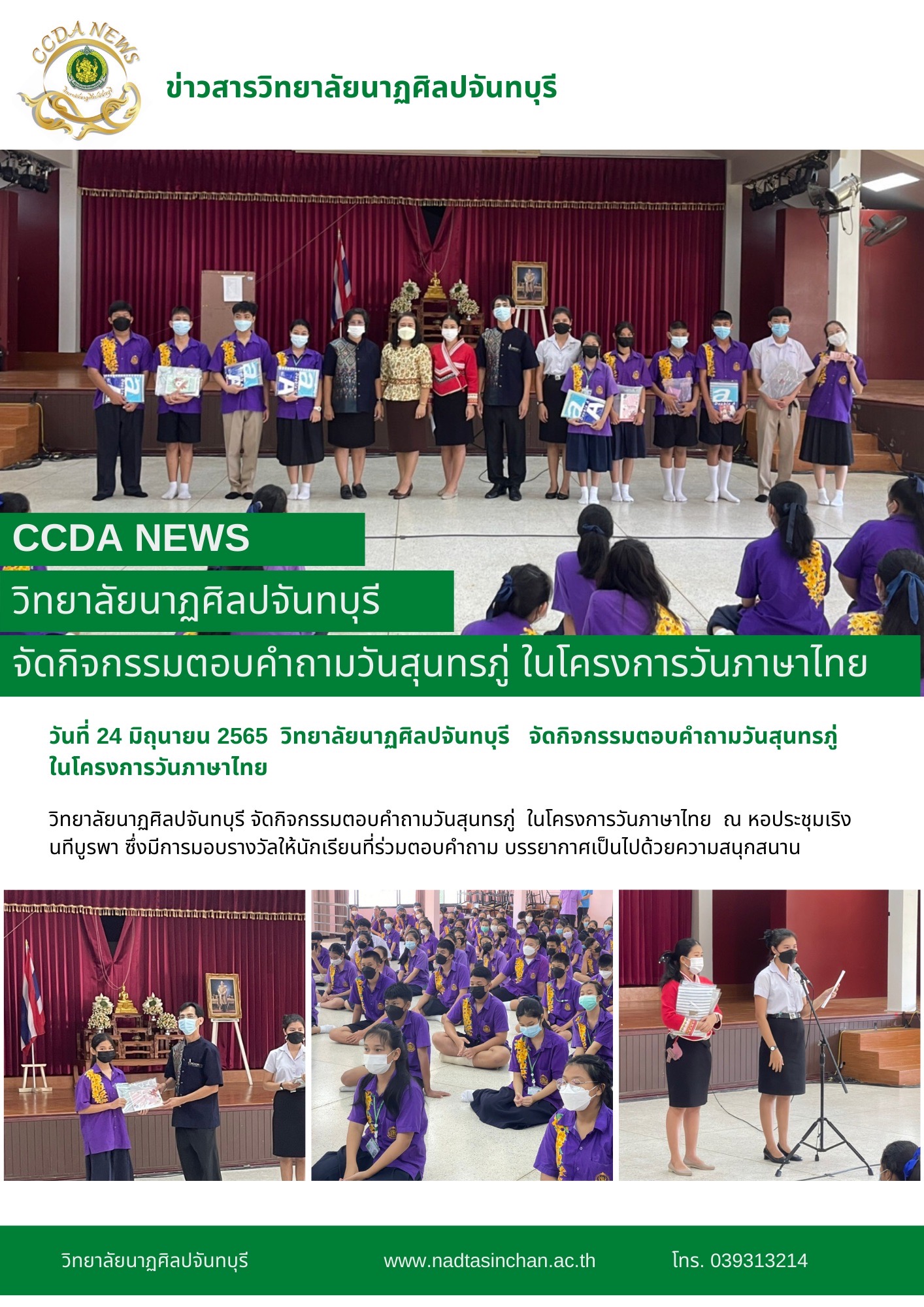 วันที่ 24 มิถุนายน 2565 วิทยาลัยนาฏศิลปจันทบุรี จัดกิจกรรม?ตอบคำถามวันสุนทรภู่