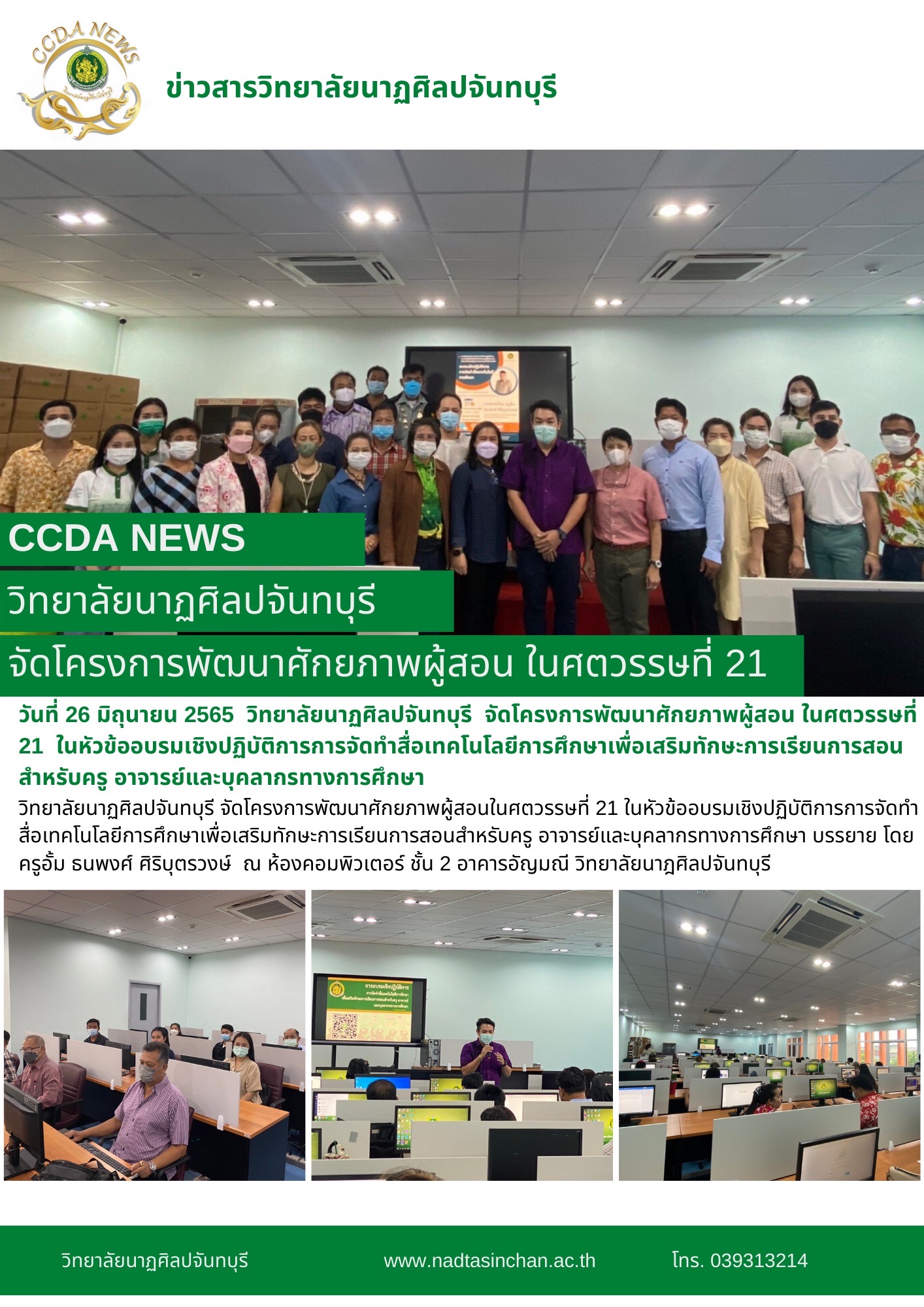 วิทยาลัยนาฏศิลปจันทบุรี จัดโครงการพัฒนาศักยภาพผู้สอนในศตวรรษที่ 21 ในหัวข้ออบรมเชิงปฏิบัติการการจัดทำสื่อเทคโนโลยีการศึกษาเพื่อเสริมทักษะการเรียนการสอนสำหรับครู อาจารย์และบุคลากรทางการศึกษา บรรยาย โดย ครูอั้ม ธนพงศ์ ศิริบุตรวงษ์ วันอาทิตย์ที่ 26 มิถุนายน 2565 ณ ห้องคอมพิวเตอร์ ชั้น 2 อาคารอัญมณี วิทยาลัยนาฎศิลปจันทบุรี