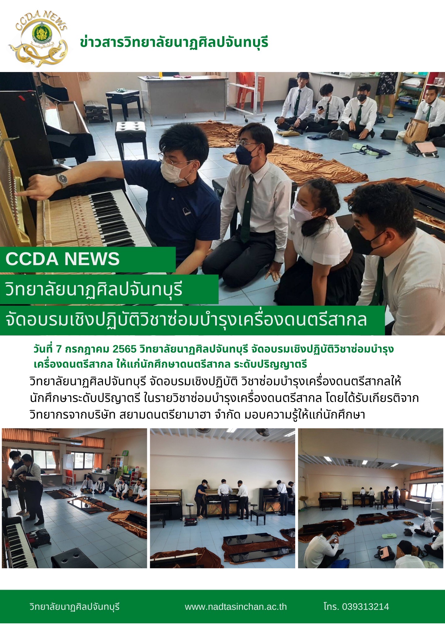 วันที่ 7 กรกฎาคม 2565 วิทยาลัยนาฏศิลปจันทบุรี จัดอบรมเชิงปฏิบัติ วิชาซ่อมบำรุงเครื่องดนตรีสากลให้นักศึกษาระดับปริญาตรี ในรายวิชาซ่อมบำรุงเครื่องดนตรีสากล โดยได้รับเกียรติจาก วิทยากรจากบริษัท สยามดนตรียามาฮา จำกัด มอบความรู้ให้แก่นักศึกษา