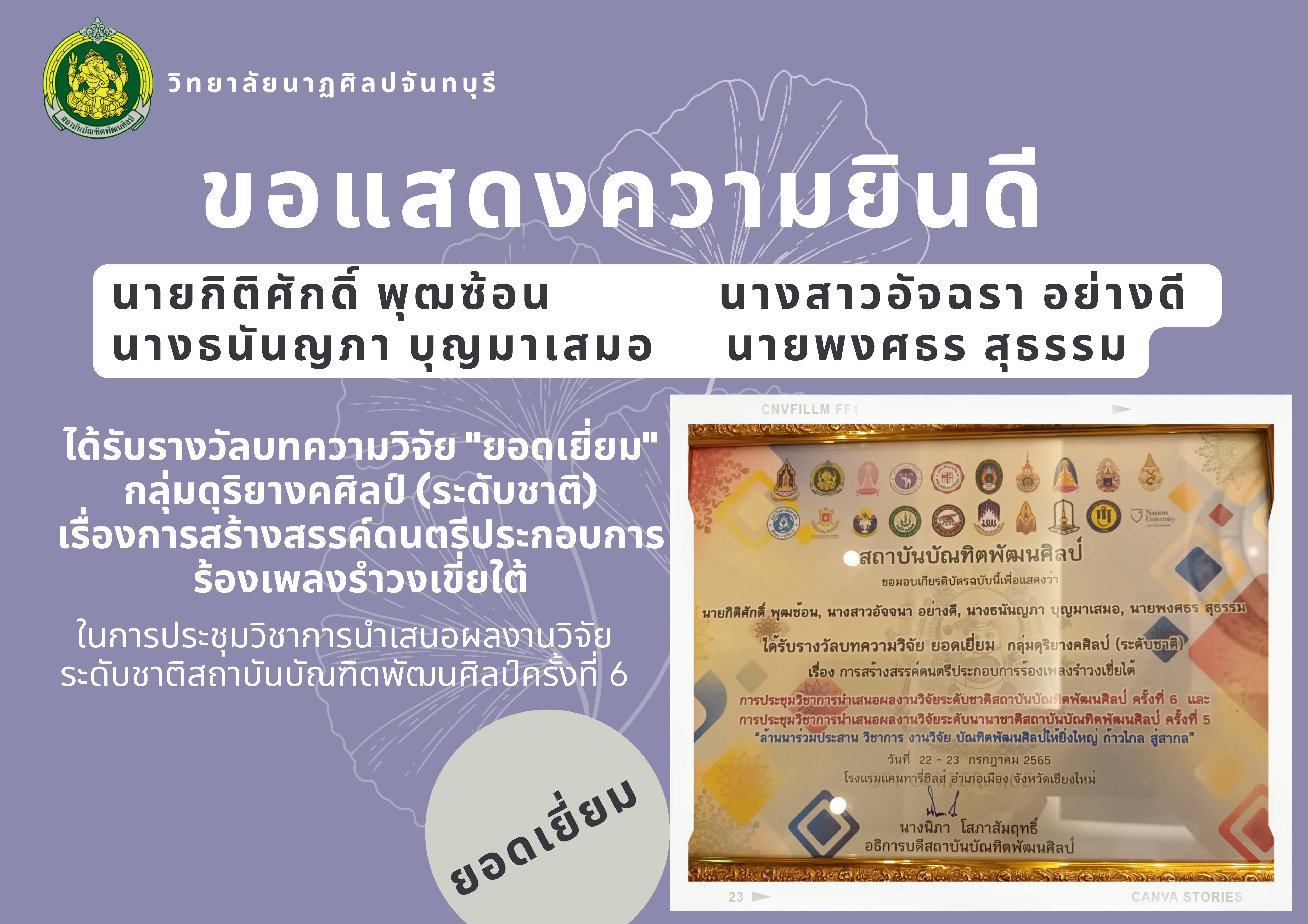 วิทยาลัยนาฏศิลปจันทบุรี ขอแสดงความยินดีกับ นายกิติศักดิ์ พุฒซ้อน นางสาวอัจฉรา อย่างดี นางธนันญภา บุญมาเสมอ นายพงศธร สุธรรม ได้รับรางวัลบทความวิจัย