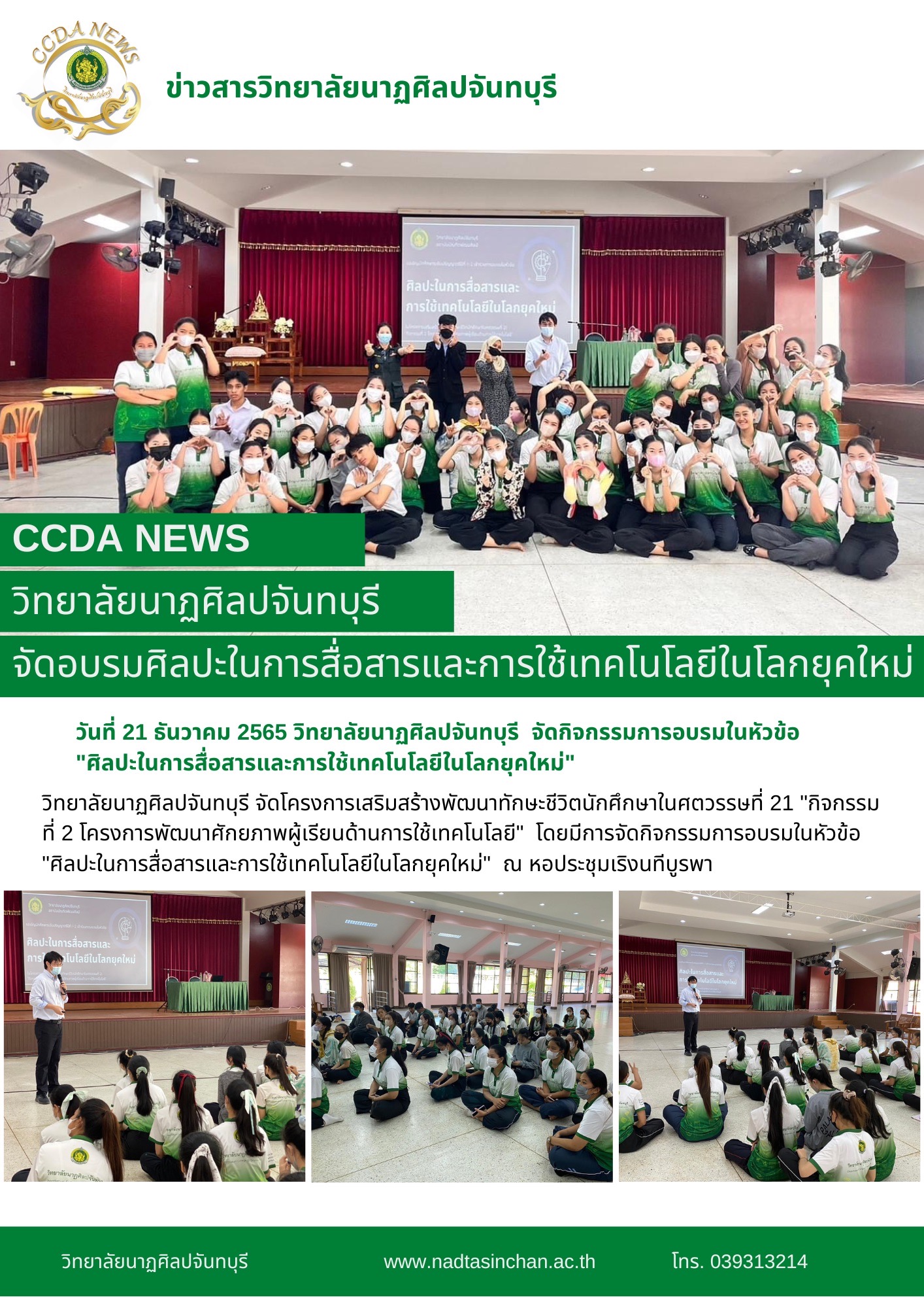 วิทยาลัยนาฏศิลปจันทบุรี จัดโครงการเสริมสร้างพัฒนาทักษะชีวิตนักศึกษาในศตวรรษที่ 21 "กิจกรรมที่ 2 โครงการพัฒนาศักยภาพผู้เรียนด้านการใช้เทคโนโลยี" โดยมีการจัดกิจกรรมการอบรมในหัวข้อ "ศิลปะในการสื่อสารและ
