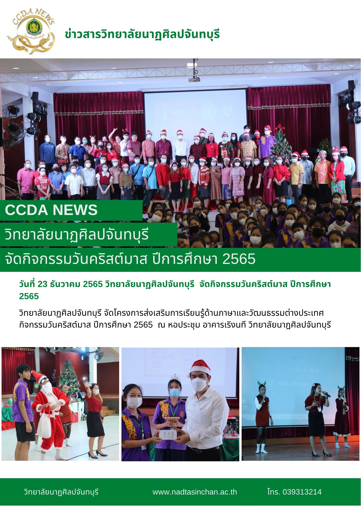 วิทยาลัยนาฏศิลปจันทบุรี จัดโครงการส่งเสริมการเรียนรู้ด้านภาษาและวัฒนธรรมต่างประเทศ กิจกรรมวันคริสต์มาส ปีการศึกษา 2565 ในวันที่ 23 ธันวาคม 2565 ณ หอประชุม อาคารเริงนที วิทยาลัยนาฎศิลปจันทบุรี