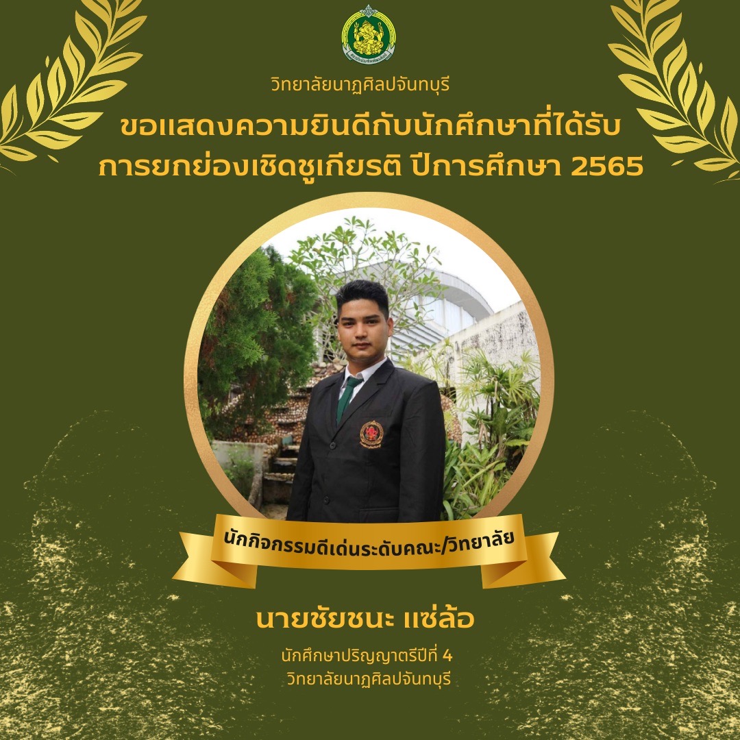วิทยาลัยนาฏศิลปจันทบุรี ขอแสดงความยินดีกับนักศึกษาที่ได้รับ การยกย่องเชิดชูเกียรติ ปีการศึกษา 2565 ประเภท นักกิจกรรมดีเด่นระดับคณะ/วิทยาลัย นายชัยชนะ แซ่ล้อ นักศึกษาปริญญาตรีปีที่ 4 วิทยาลัยนาฎศิลปจัน