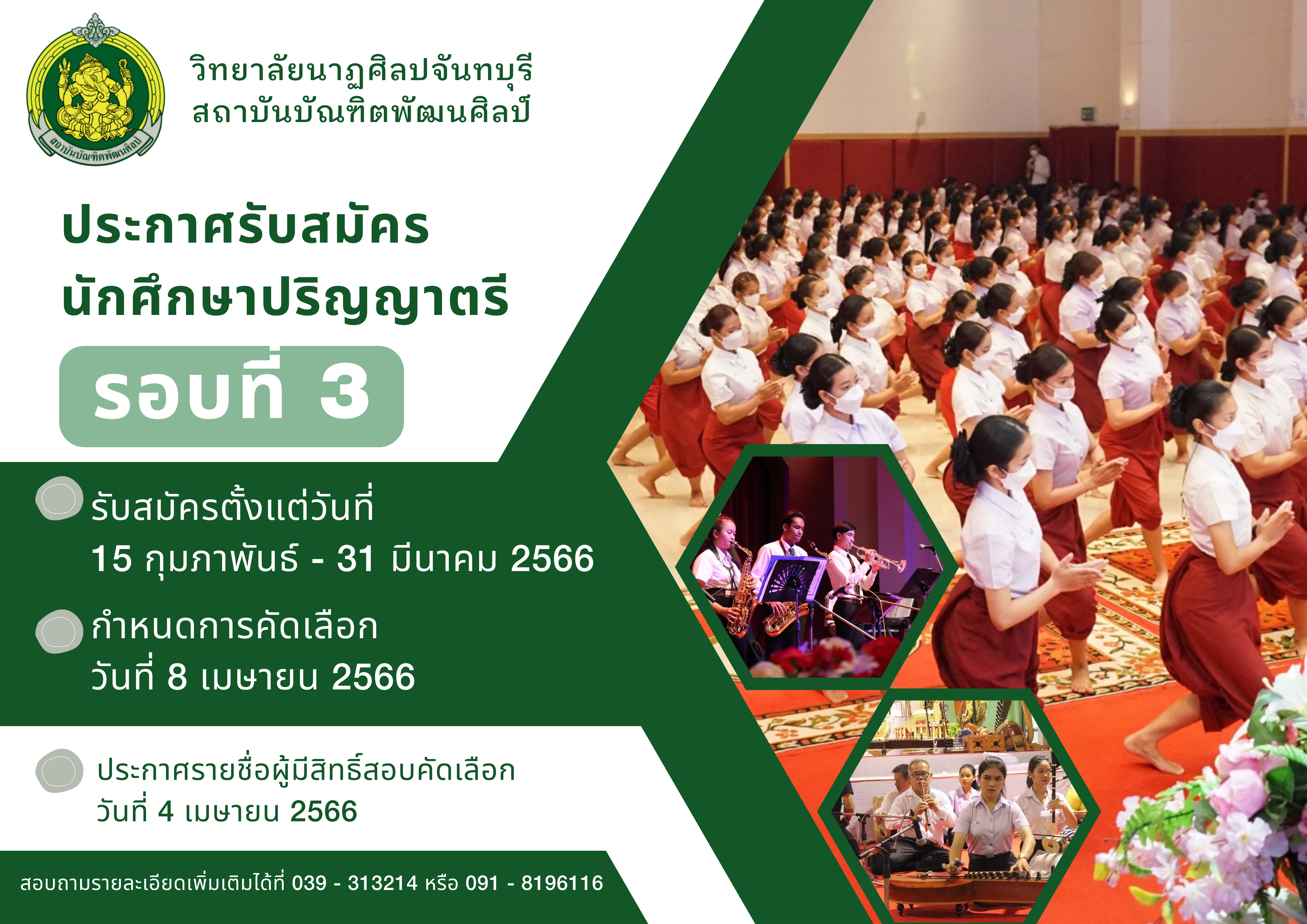 ?การรับสมัครนักศึกษาใหม่ ประจำปีการศึกษา ๒๕๖๖ (รอบที่ ๓) รับสมัครตั้งแต่วันที่ ๑๕ กุมภาพันธ์ - ๓๑ มีนาคม ๒๕๖๖ กำหนดการคัดเลือก วันที่ ๘ เมษายน ๒๕๖๖