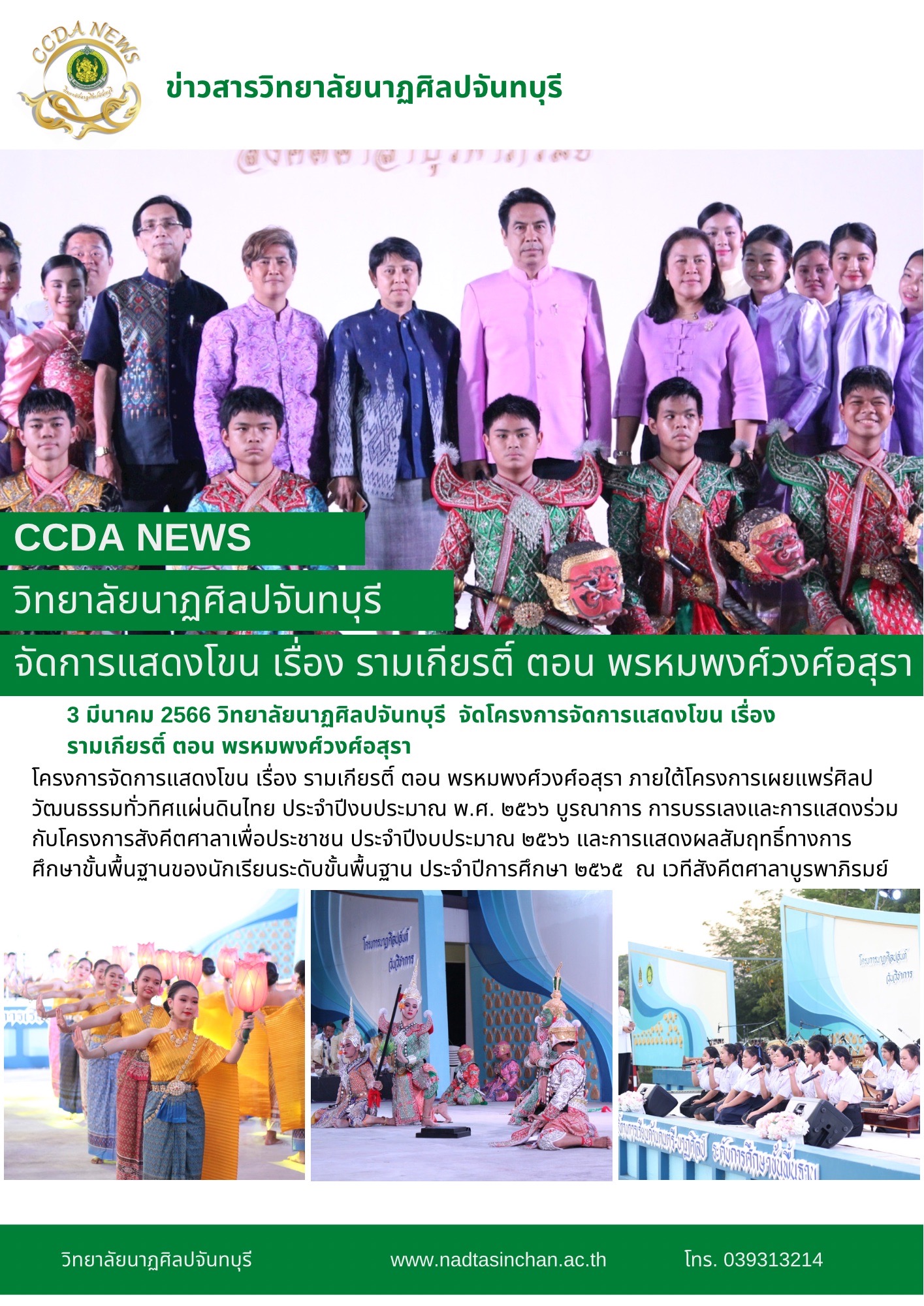 วิทยาลัยนาฏศิลปจันทบุรี จัดโครงการจัดการแสดงโขน เรื่อง รามเกียรติ์ ตอน พรหมพงศ์วงศ์อสุรา ภายใต้โครงการเผยแพร่ศิลปวัฒนธรรมทั่วทิศแผ่นดินไทย ประจำปีงบประมาณ พ.ศ. ๒๕๖๖ บูรณาการ การบรรเลงและการแสดงร่วมกับโครงการสังคีตศาลาเพื่อประชาชน ประจำปีงบประมาณ ๒๕๖๖ และการแสดงผลสัมฤทธิ์ทางการศึกษาขั้นพื้นฐานของนักเรียนระดับขั้นพื้นฐาน ประจำปีการศึกษา ๒๕๖๕ วันที่ ๓ มีนาคม ๒๕๖๖ เวลา ๑๗.๓๐ - ๒๑.๐๐ น. ณ เวทีสังคีตศาลาบูรพาภิรมย์ วิทยาลัยนาฏศิลปจันทบุรี