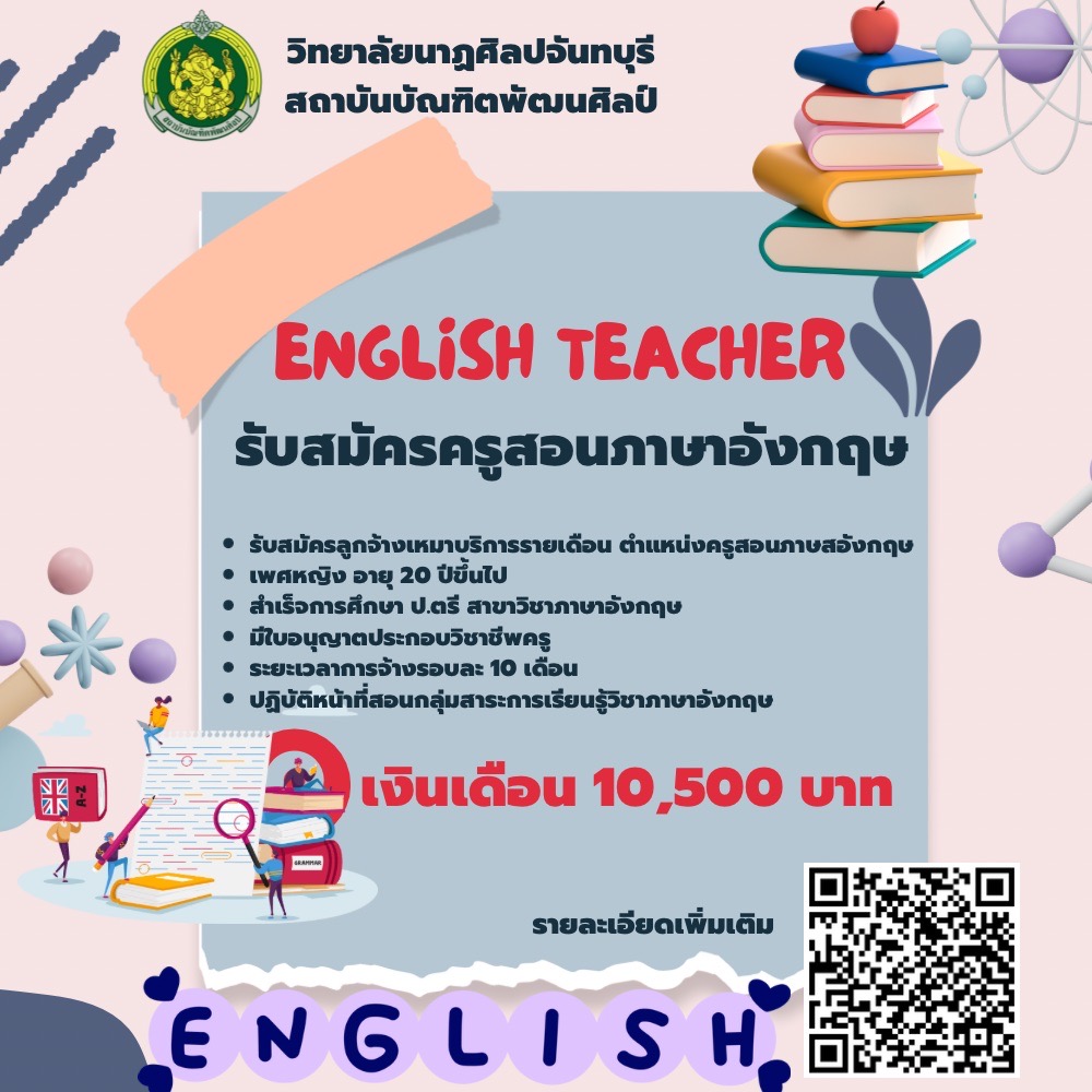 วิทยาลัยนาฏศิลปจันทบุรี สถาบันบัณฑิตพัฒนศิลป์ รับสมัครลูกจ้างเหมาบริการรายเดือน ตำแหน่งครูสอนภาษาอังกฤษ เพศหญิง อายุ 20 ปีขึ้นไป สำเร็จการศึกษา ป.ตรี สาขาวิชาภาษาอังกฤษ มีใบอนุญาตประกอบวิชาชีพครู ระยะเวลาการจ้างรอบละ 10 เดือน ปฏิบัติหน้าที่สอนกลุ่มสาระการเรียนรู้วิชาภาษาอังกฤษ เงินเดือน 10,500 บาท