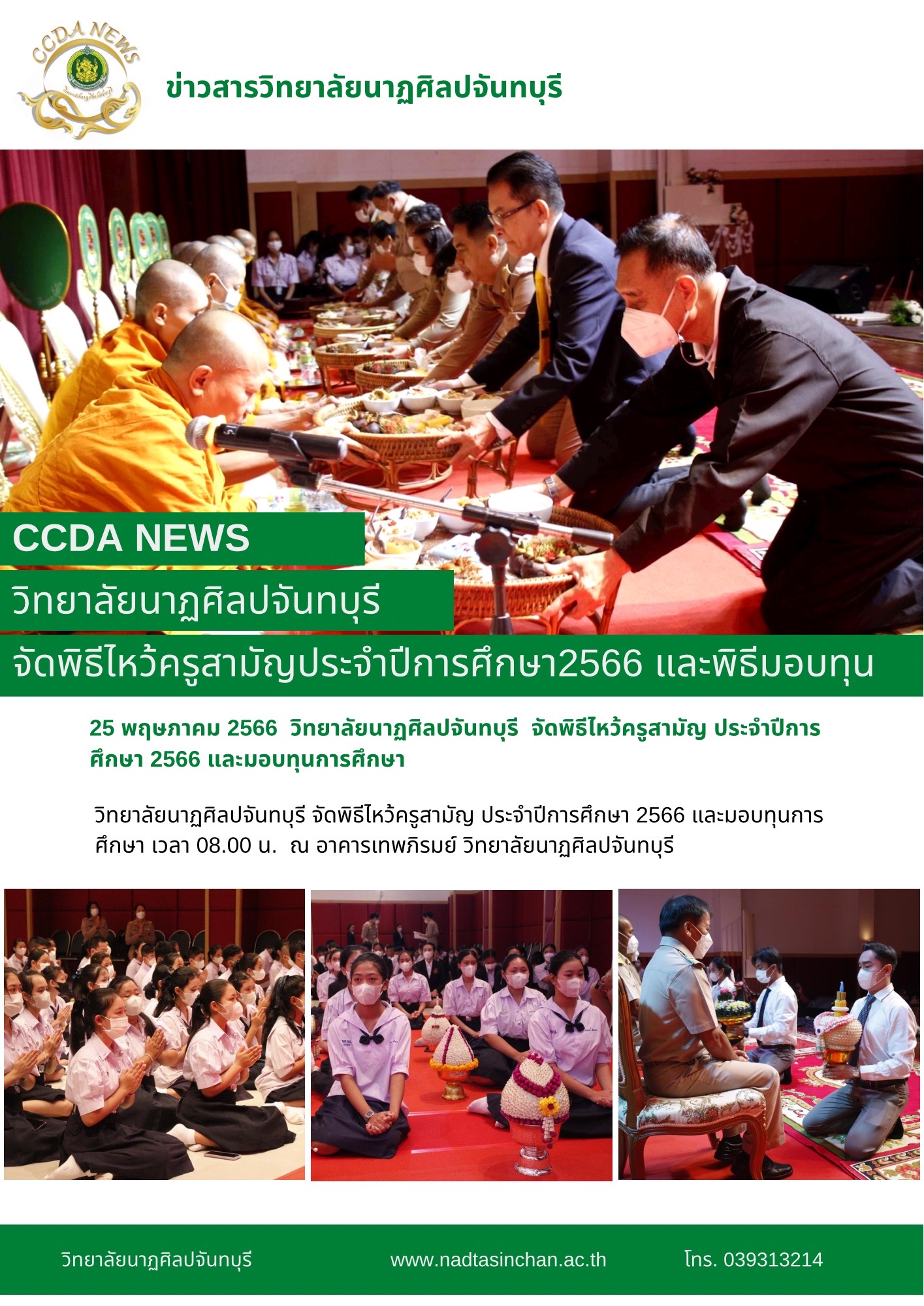 วิทยาลัยนาฏศิลปจันทบุรี จัดพิธีไหว้ครูสามัญ ประจำปีการศึกษา 2566 และมอบทุนการศึกษา เวลา 08.00 น. วันที่ 25 พฤษภาคม 2566 ณ อาคารเทพภิรมย์ วิทยาลัยนาฏศิลปจันทบุรี