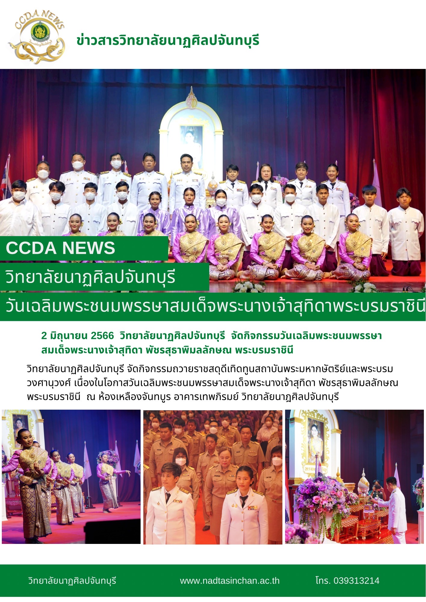 วิทยาลัยนาฏศิลปจันทบุรี จัดกิจกรรมถวายราชสดุดีเทิดทูนสถาบันพระมหากษัตริย์และพระบรมวงศานุวงศ์ เนื่องในโอกาสวันเฉลิมพระชนมพรรษาสมเด็จพระนางเจ้าสุทิดา พัชรสุธาพิมลลักษณ พระบรมราชินี ในวันที่ 2 มิถุนายน 2