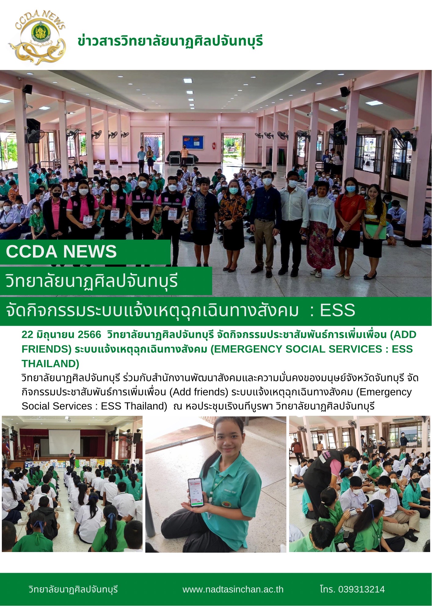 วิทยาลัยนาฏศิลปจันทบุรี ร่วมกับสำนักงานพัฒนาสังคมและความมั่นคงของมนุษย์จังหวัดจันทบุรี จัดกิจกรรมประชาสัมพันธ์การเพิ่มเพื่อน (Add friends) ระบบแจ้งเหตุฉุกเฉินทางสังคม (Emergency Social Services : ESS Thailand) วันที่ 22 มิถุนายน 2566 ณ หอประชุมเริงนทีบูรพา วิทยาลัยนาฏศิลปจันทบุรี